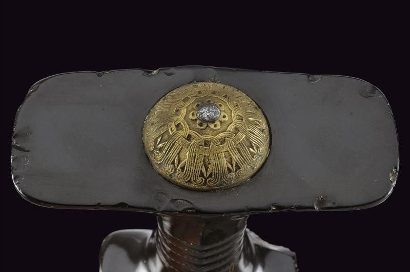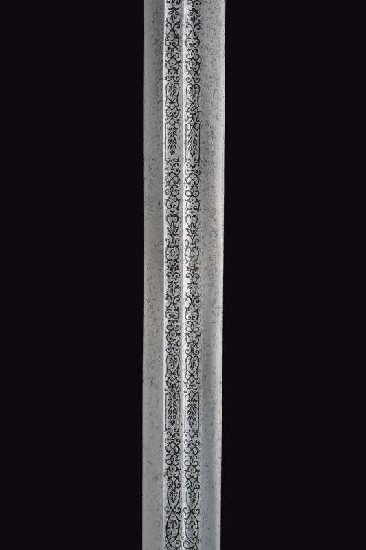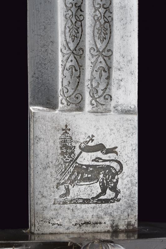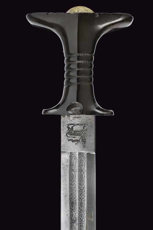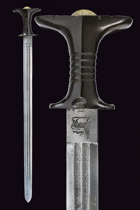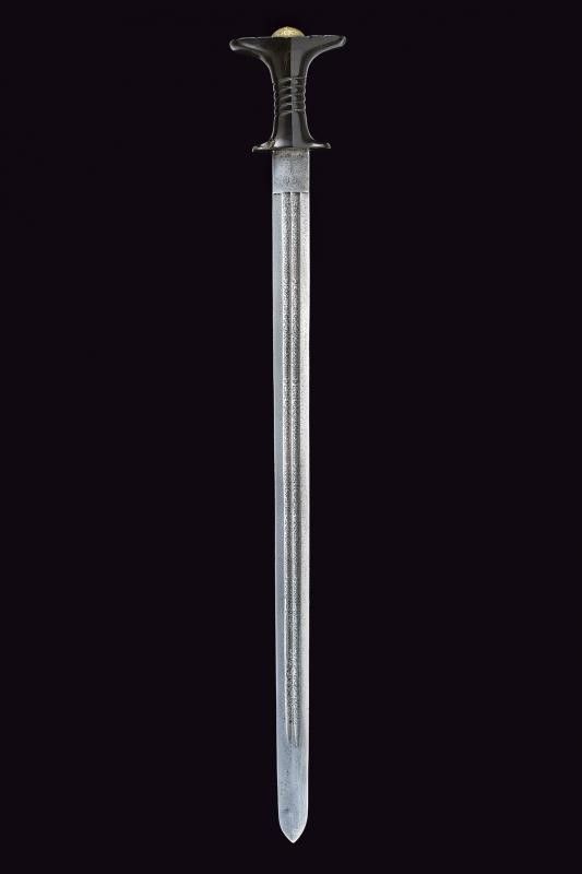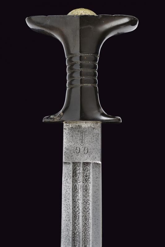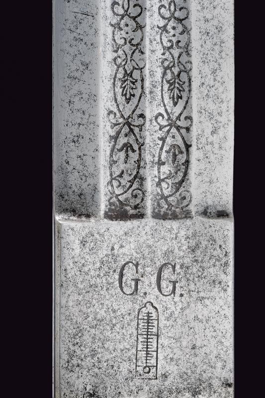 lunghezza 92 cm. Bella e larga lama a due fili dotata di doppia scanalatura a tutta la lunghezza finemente incisa a motivi floreali, tallone rettangolare marcato su un lato 'G.G.' e sull'altro con leone di Giuda inciso. Massiccia impugnatura a doppia 'T' in bachelite (mancanze), cappa semisferica in ottone, incisa a motivi geometrici.