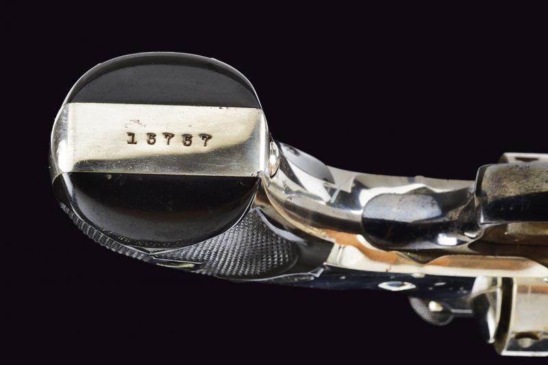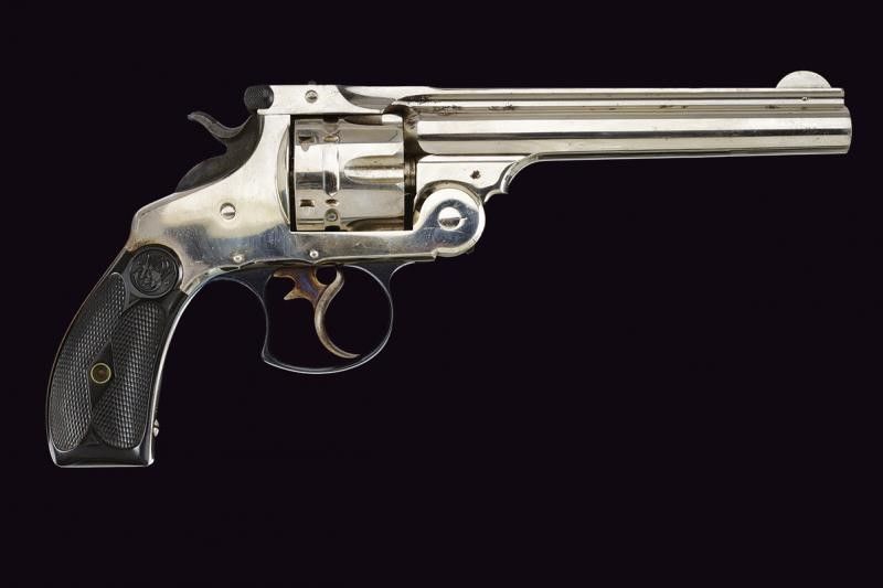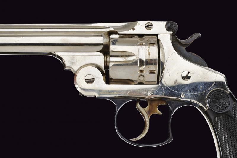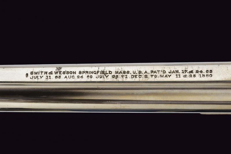 USA, lunghezza 27,4 cm. 1881 Canna cilindrica rigata da 6-1/2', con alta bindella recante dicitura della ditta in due righe con brevetti sino al 1880. Cal. 44 Russian. Anima pulita e ben conservata, con qualche macchia, rigatura ben visibile. Tamburo a sei colpi da 1-7/16'. Meccanica funzionante. Cane tartarugato, ponticello brunito. Finitura nichelata ben conservata. Matricola '157xx' coeva su canna, gancetto, tamburo e impugnatura. Guancette in gommadura zigrinata e con monogramma della Smith & Wesson. Interessante.