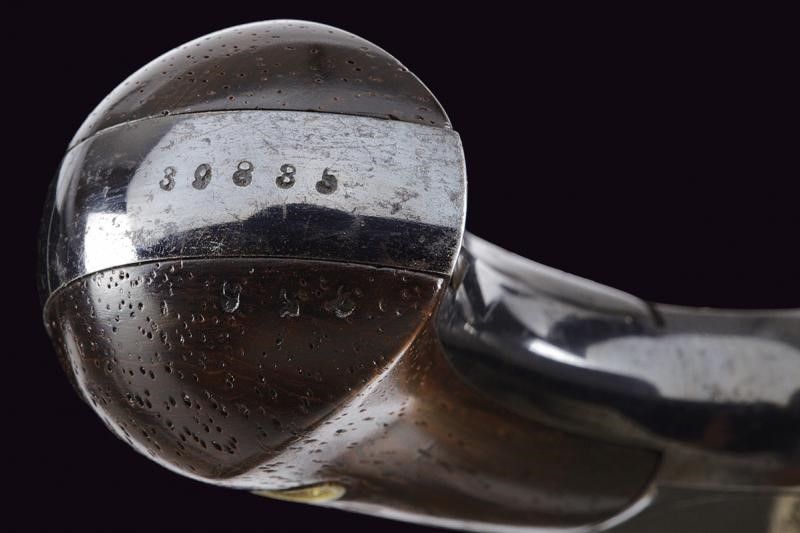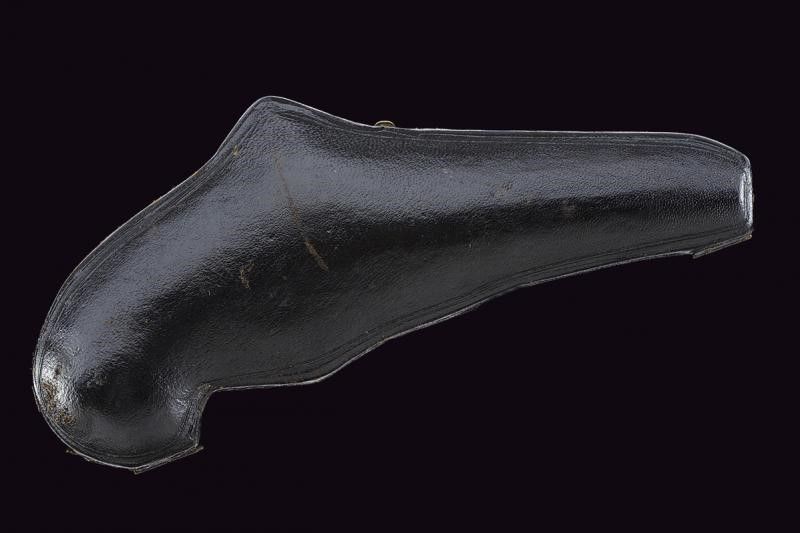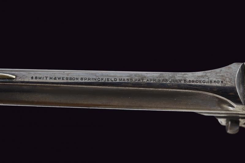 USA, lunghezza 16 cm. 1868 - 1881 Canna cilindrica con alta bindella dotata di mirino e marcature della ditta con brevetti, basculante verso l'alto, cal. 22 rimfire short. Tamburo a sette colpi. Meccanica funzionante. Guancette lisce in legno. Ben conservata con buona parte della brunitura antica color blu. In astuccio di pelle di un rivenditore di Lione.