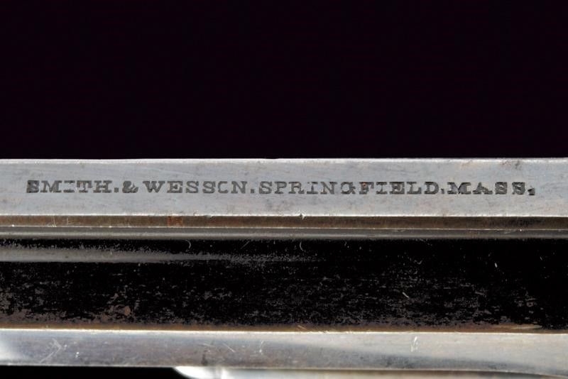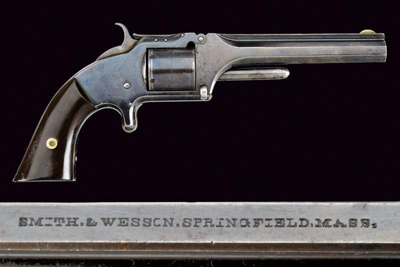 USA, lunghezza 25 cm. 1861 - 1874 Canna ottagonale da 5', mirino in metallo bianco, marcatura della ditta al dorso, cal. 32 rimfire long. Tamburo a sei colpi con brevetti del 1855, 1859 e 1860. Castello con grilletto a sprone, meccanica funzionante. Guancette in legno di rosa. Resti di brunitura probabilmente antica, al 70%. Mat. '21xxx'. Numeri di assemblaggio all'interno, coevi su varie parti.