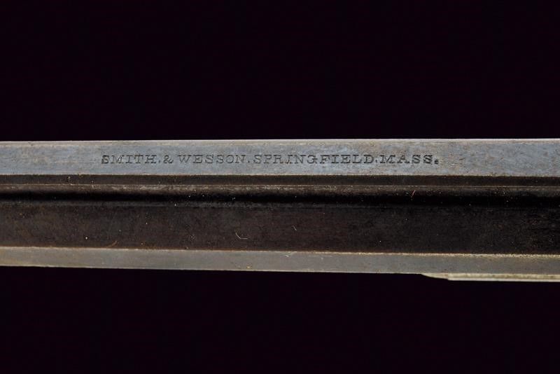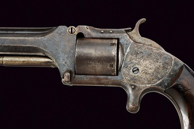 USA, lunghezza 28.5 cm. 1862 Canna ottagonale rigata, da 6', mirino a semicerchio in metallo bianco sulla bindella, marcatura 'SMITH & WESSON SPRINGFIELD MASS.', cal. 32. Tamburo liscio a sei colpi con resti marcatura dei brevetti (anni 1855, 1859, 1860). Resti di brunitura originale. Sul lato sinistro dedica 'Presented to John McKay by friends in the U.S. Armory Springfield Mass. Auguri. 25th 1862'. Apertura con basculamento verso l'alto. Grilletto a sprone. Matr. '61xx', guancetta destra con matricola coeva all'interno. Guancette in noce. Meccanica funzionate.