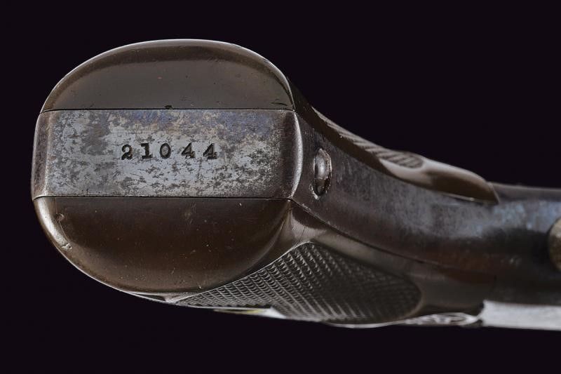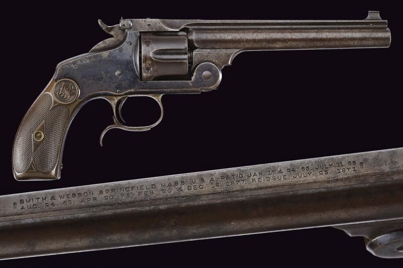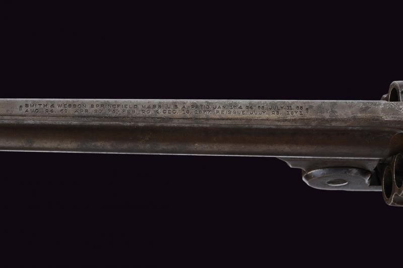 USA, lunghezza 30,5 cm. 1878 Canna tonda rigata da 6-1/2', bindella con marcatura della ditta fra croci e brevetti sino al 1877, con 'REISSUE' 1871. Cal. 44 Russian. Rigatura visibile con qualche intaccatura all'interno. Tamburo a sei colpi. Meccanica funzionante. Resti di brunitura antica al 15-20% circa. Ponticello con poggiadito aggiunto. Qualche intaccatura. L'estrattore non rientra automaticamente a revolver completamente aperto. Matricola '210xx' coeva su canna e impugnatura. Guancette in gommadura zigrinata, con monogramma della ditta.