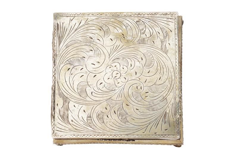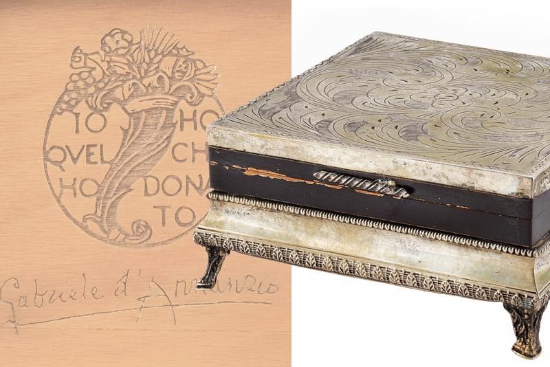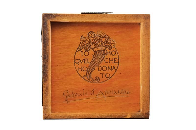 dimensioni 11 x 5 x 11 cm. Prima metà del XX Secolo A forma di parallelepipedo, in legno, con fornimenti in argento decorati a motivi floreali, marcata '800' e con punzone poco leggibile. Nella parte interna del coperchio il motto 'IO HO QUELLO CHE HO DONATO' e firma Gabriele d'Annunzio.
