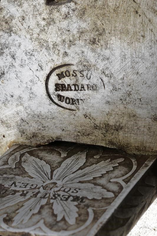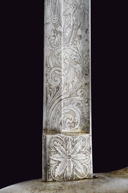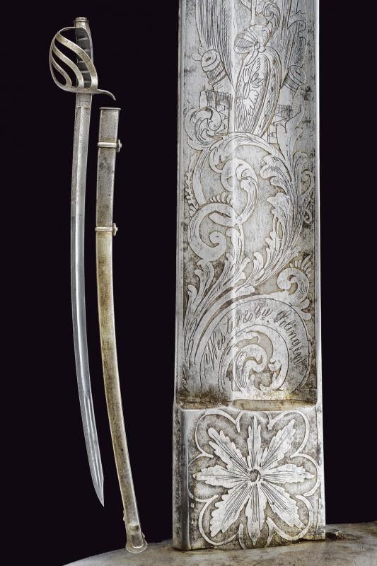 Terzo quarto del XIX Secolo Bella lama curva a un filo, punta incavata al dorso e breve controfilo, con sguscio a tutta lunghezza che si fa duplice al debole, finemente incisa al forte, recante sul lato di terza il cartiglio con iscrizione 'TAGLIO FERRO' per le lame di altà qualità, un trofeo di scudi e bandiere circondato da racemi e, al tallone marcatura 'WESTER & CO. SOLINGEN'; sul lato di quarta un trofeo di bandiere con scudo, elmo e cannoni, la firma di Wester & Co. e tallone con decoro floreale. Fornimento in ferro a quattro rami di guardia, marcato al dorso 'MOSSO SPADARO TORINO'. Impugnatura in ebano a settori zigrinati. Cappetta lunga. Fodero in ferro (un bozzo) ben calzante, a due campanelle. Qualche intaccatura ai fornimenti, la lama in condizioni molto buone e con eleganti decorazioni.