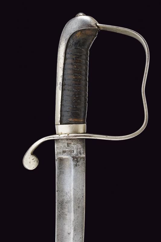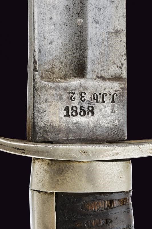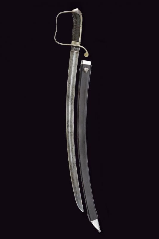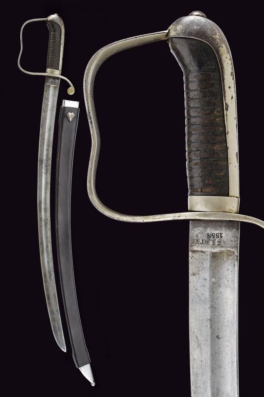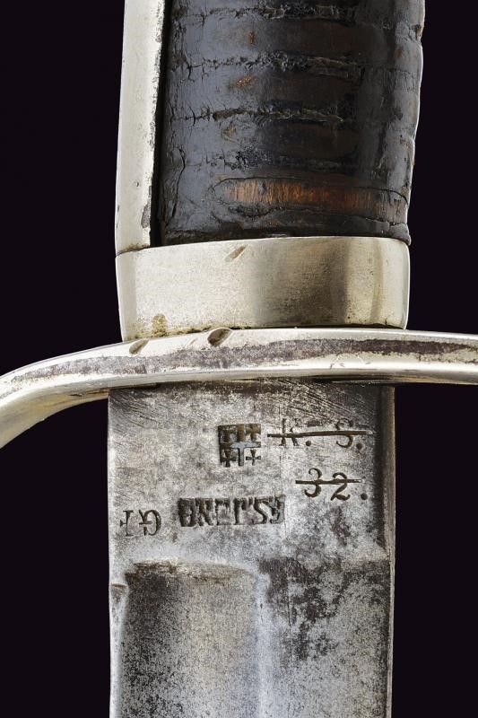 lunghezza 77 cm. Seconda metà del XIX Secolo Ampia lama curva sgusciata su entrambe le facce. Tallone datato '1858' e marcato 'J.J.B 32', 'GF', 'FS JUNG', e con numeri sbarrati. Fornimento con resti di nichelatura. Impugnatura con rivestimento in pelle recante piccole mancanze, segni d'uso e del tempo. Fodero in cuoio (più tardo?) con fornimenti in ferro.