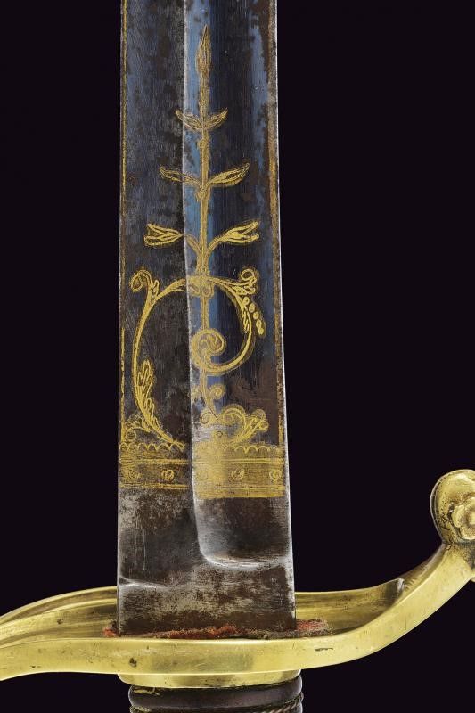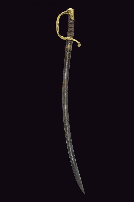 USA, lunghezza 88 cm. Prima metà del XIX Secolo Lama curva a un filo e controfilo, sgusciata, incisa al forte, recante sul lato di quarta disegni a racemi e un trofeo con resti di doratura, sul lato di terza l'aquila americana con cartiglio recante il motto 'E PLURIBUS UNUM' caricata con scudo a quindici stelle, alla base un trofeo, anche queste incisioni con resti di doratura. Qualche dente al filo e tracce di fondo brunito. Fornimento sul tipo francese in ottone con fiorami in rilievo e guardia dotata di un ramo laterale. Cappetta corta con fronde di lauro. Impugnatura con rivestimento in cuoio e trecciola in rame. Priva di fodero.