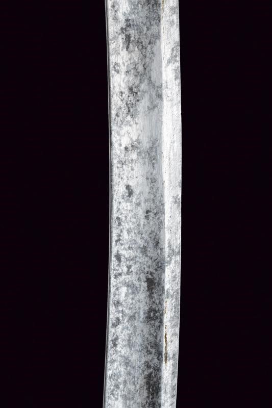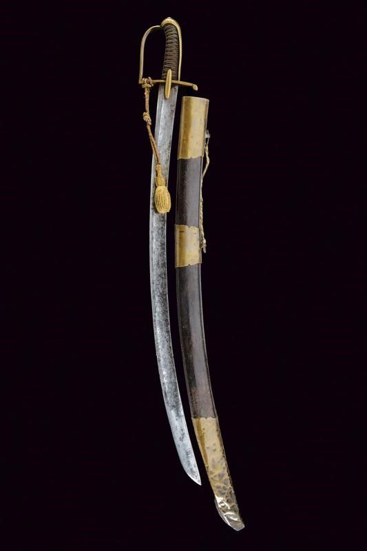 lunghezza 98,7 cm. Fine XVIII inizio XIX Secolo Ampia lama curva a un filo e breve controfilo, sgusciata. Lievissime intaccature, segni d'uso e del tempo. Un dente al filo. Fornimento in ottone con guardia a staffa e lunghe alette fermafodero bombate. Cappetta lunga liscia faccettata. Impugnatura lignea dotata di vecchio rivestimento in manica di cuoio con mancanze. Avvolgimento di trecciola in ottone. Fodero in legno con rivestimento in cuoio probabilmente antico. Ampi fornimenti in ottone con bordi ondulati. Due campanelle. Munita di una dragona (pertinente?) in canutiglia dorata, con forti segni d'uso e del tempo.