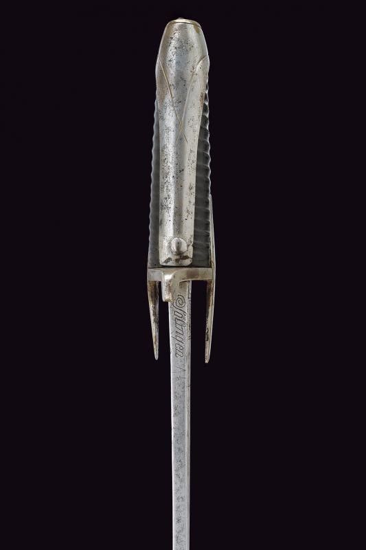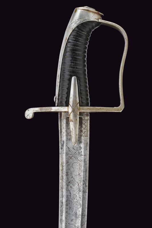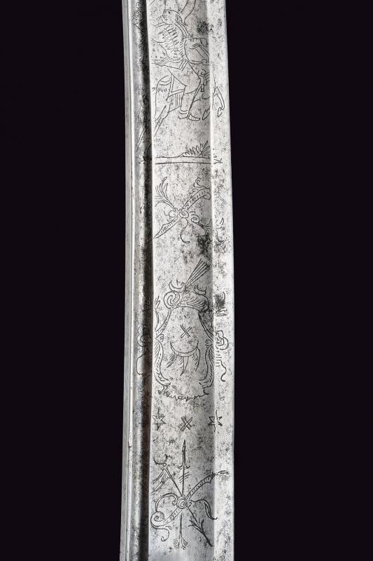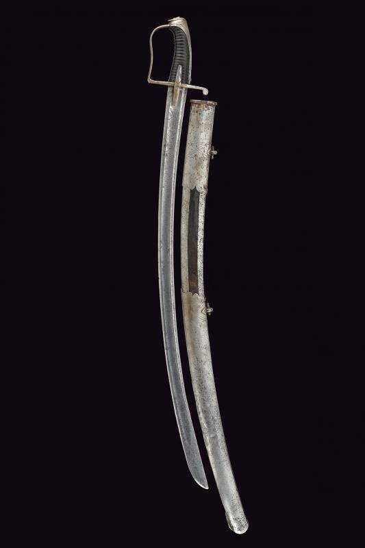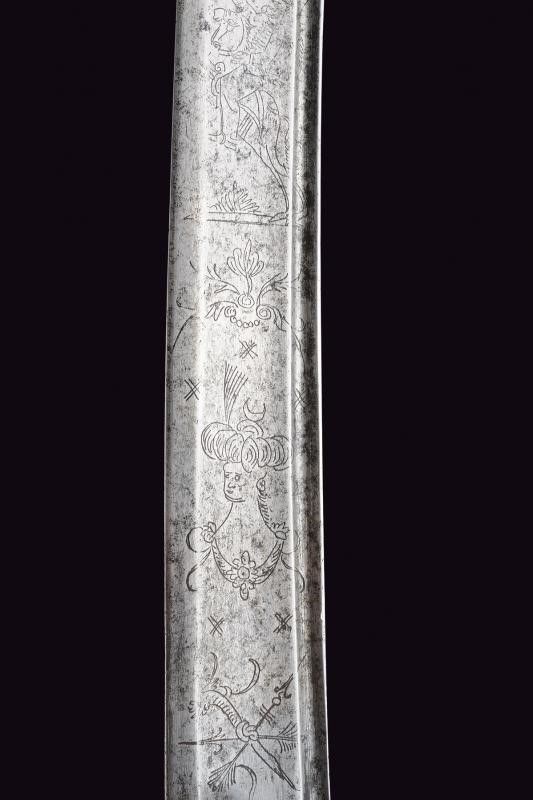fine del XVIII Sec. Lama curva a un filo e breve controfilo, ampiamente sgusciata e scanalata accanto al dorso, incisa al forte. Recante sul lato di terza effige di un ussaro a cavallo e altri piccoli decori fra i quali arco e frecce incrociati, sul lato di quarta un altro ussaro a cavallo, una testa di turco, stelle e un fregio ad arco e freccia incrociati. Fornimento in ferro con guardia a staffa, lunghe alette fermafodero. Impugnatura con rivestimento in pelle. Cappetta lunga. Decori a linee incrociate. Fodero in legno con rivestimento in cuoio (restauri?), fornimenti in ferro (alcuni bozzi) con puntale e cappa lunghi e con bande di rinforzo sempre in ferro. Due campanelle. Intaccature, segni d'uso e del tempo.