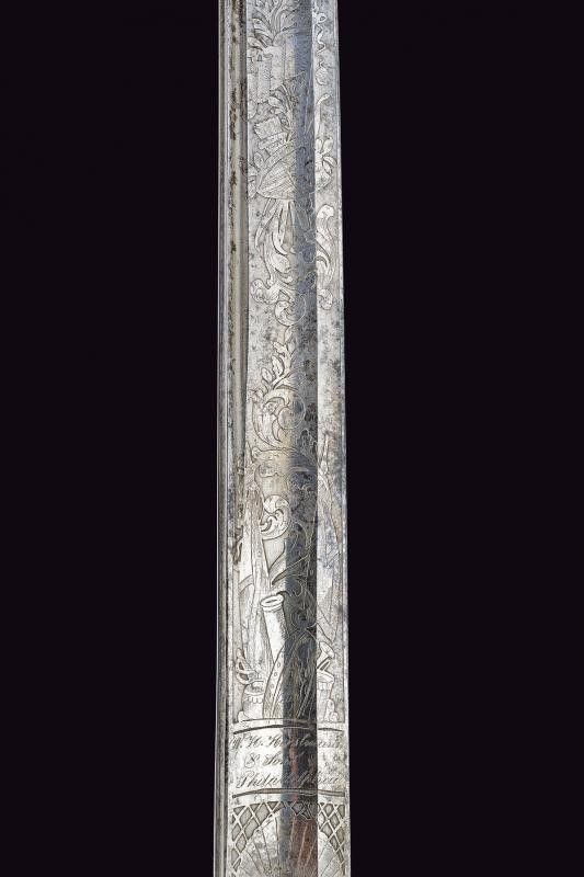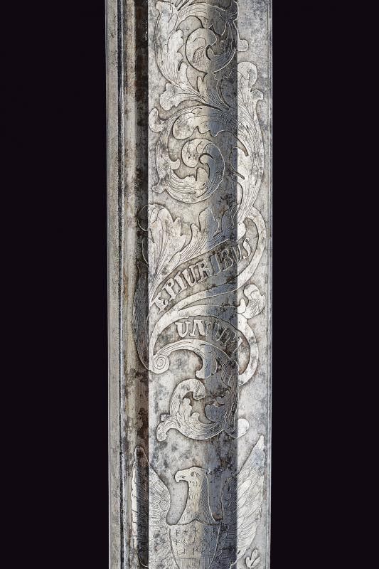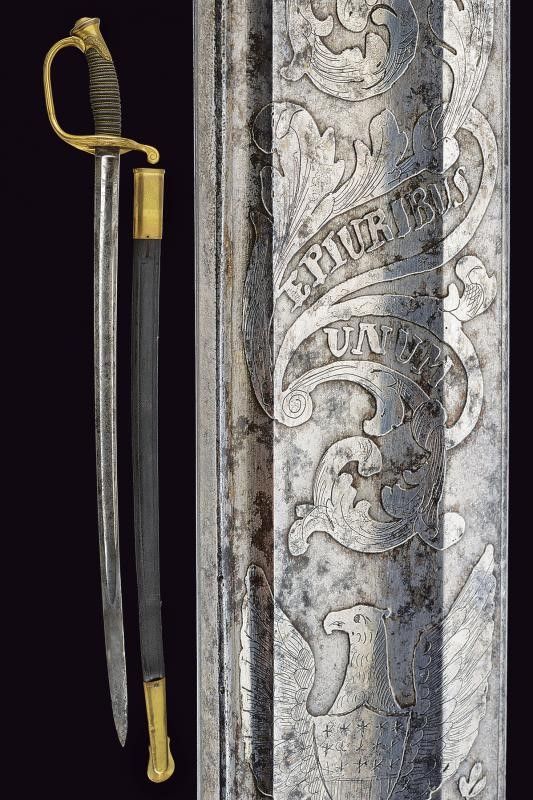 Metà del XIX Secolo Lama curva a un filo e breve controfilo (forti intaccature in punta, il resto della lama in condizioni migliori); le facce sgusciate e scanalate accanto al dorso. La lama incisa per due terzi. Sul lato di terza trofei d'armi, di scudi e di bandiere, l'aquila statunitense caricata con lo scudo e il cartiglio con il motto 'E PLURIBUS UNUM', al forte la firma 'W. H. Horstmann & Sons Philadelphia'. Sul lato di quarta trofei e fiorami che circondano la dicitura 'U.S.' Fornimento in bronzo dorato, sul modello francese, con guardia parzialmente traforata e lavorata a racemi. Cappetta corta con fronde di quercia. Impugnatura con rivestimento in pelle di pesce e trecciola d'ottone. Fodero in cuoio (fortemente consunto e leggermente corto, probabilmente si è rattrappito). Fornimenti in metallo color bronzo con resti di doratura; la cappetta (staccata) con dedica 'Presented to 1st Lieutenat J.D. Cadigan BY Captain D.J. Hogan Boston, July 18th 1854'.