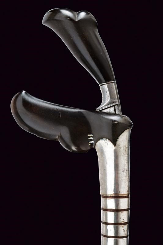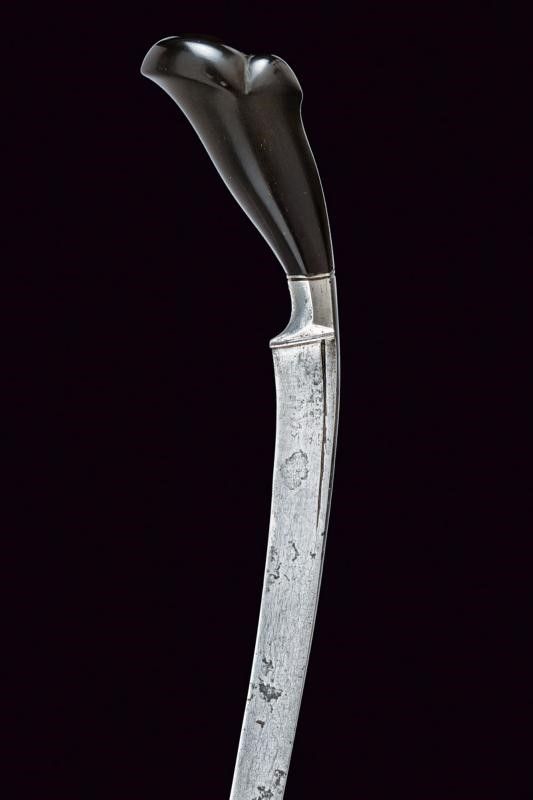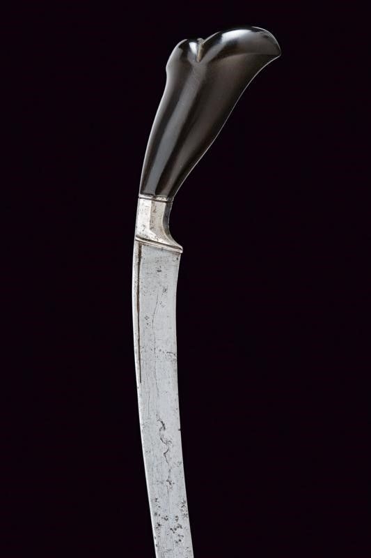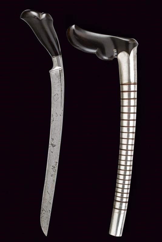 inizio del XX Sec. Lama leggermente curva a un filo in pamor. Impugnatura in legno scolpito, con base in ferro faccettato. Fodero in legno scolpito, con gandar decorato da fornimenti in lamina d'argento.