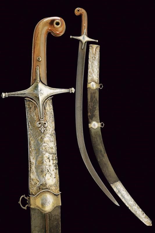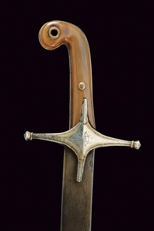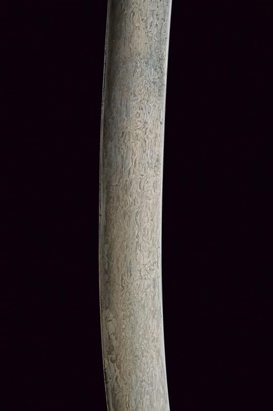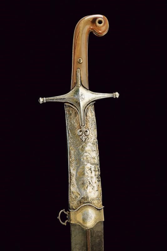 lunghezza 90.8 cm. 1800 circa Lama piatta, curva, a un filo, in bel damasco ed in buone condizioni. Fornimento in vermeil con elso a croce inciso a motivi floreali e geometrici. Cornice dell'impugnatura con nervatura centrale. Guancette in corno con pomo angolato. Fodero in legno rivestito di velluto verde (completamente liso ed in patina scura). Fornimenti in argento finemente incisi a motivi floreali e con resti di doratura (intaccature e segni d'uso e del tempo). Due anelli di sospensione su fasce convesse e decorate en suite.