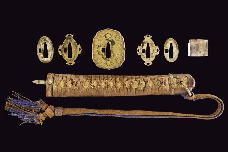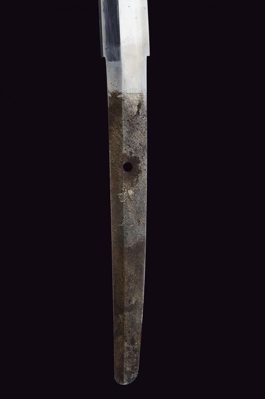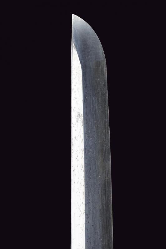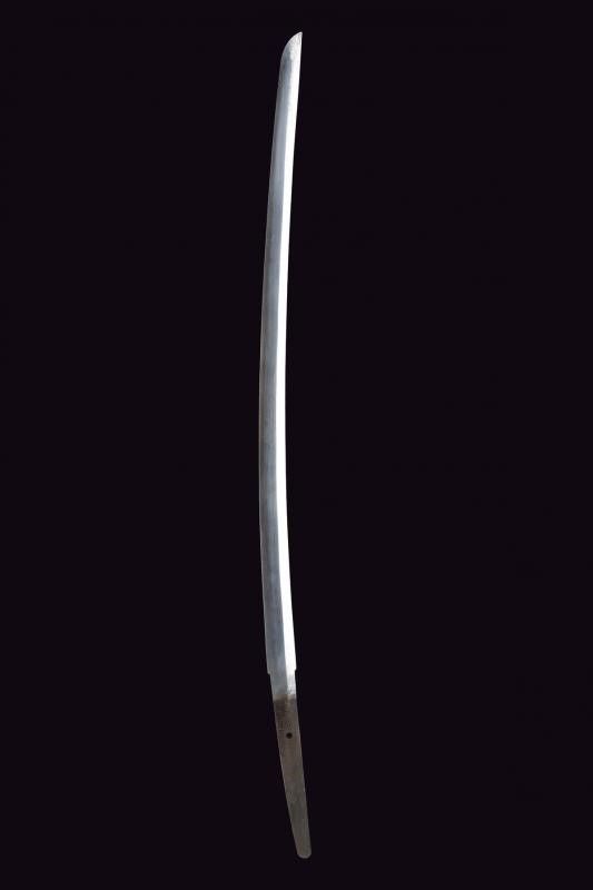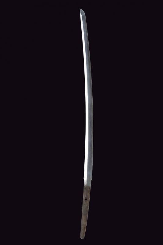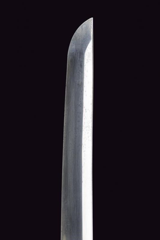 lunghezza 94.5 cm. 1934 Lama (Nagasa 66.5 cm) con hamon e hada poco visibili, nakago mei: 'Takeisa', con datazione Showa 9°, anno 1934. Habaki in rame. Completo del koshirae, con alcune mancanze alla tzuka, dragona in colorazione blu-marrone ad indicare il grado di ufficiale inferiore.