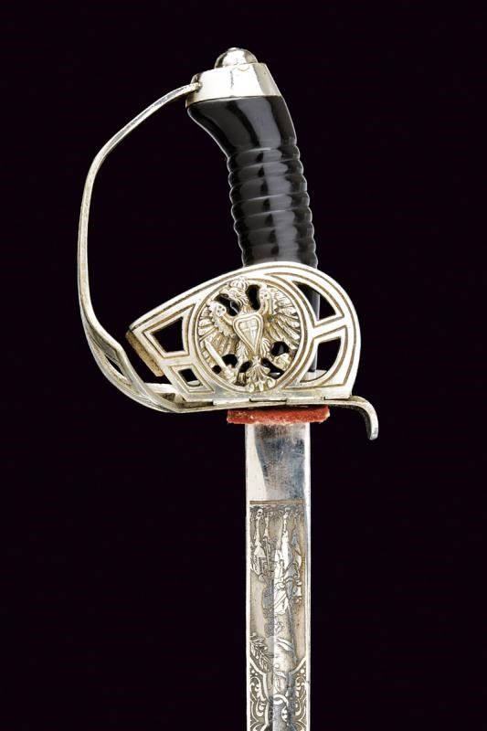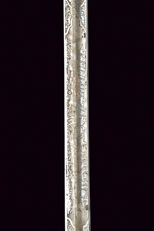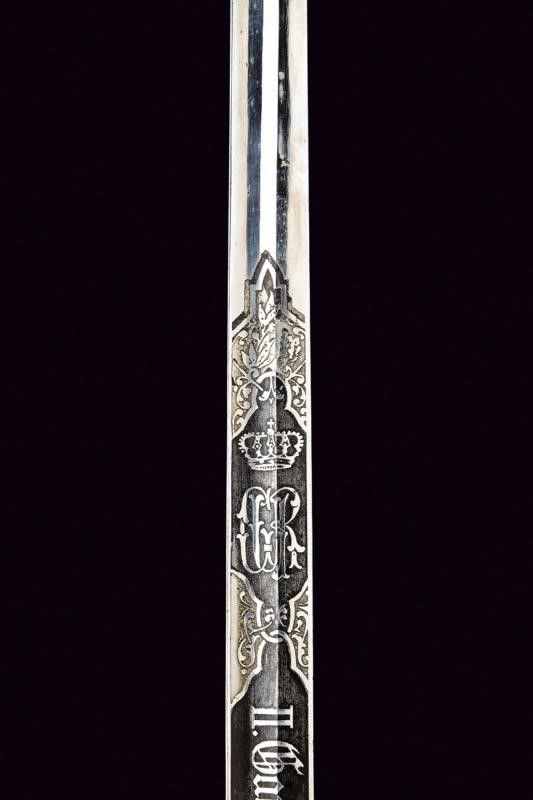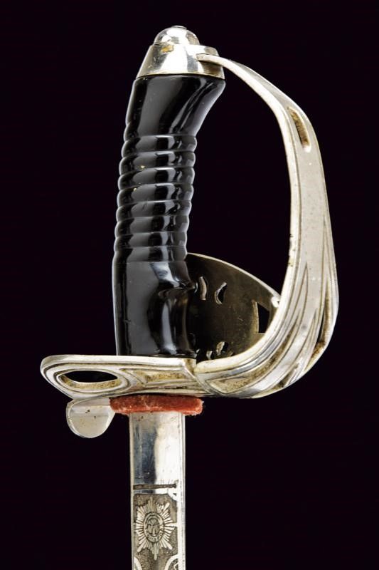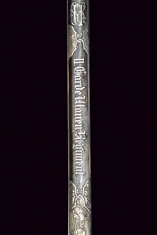 lunghezza 97 cm. primo quarto del XX Sec. Lama dritta a un filo e controfilo con ampio sguscio, finemente incisa sul lato di terza, recante monogramma regio e iscrizione 'II Garde Ulanen Regiment' su fondo blu; la base con effige di ulano a cavallo; sul lato di quarta scena di cavalleria, testa di un cavallo e la stella dell'Aquila Nera. Fornimento nichelato traforato, le due valve pieghevoli. Impugnatura in bachelite. Priva di fodero.