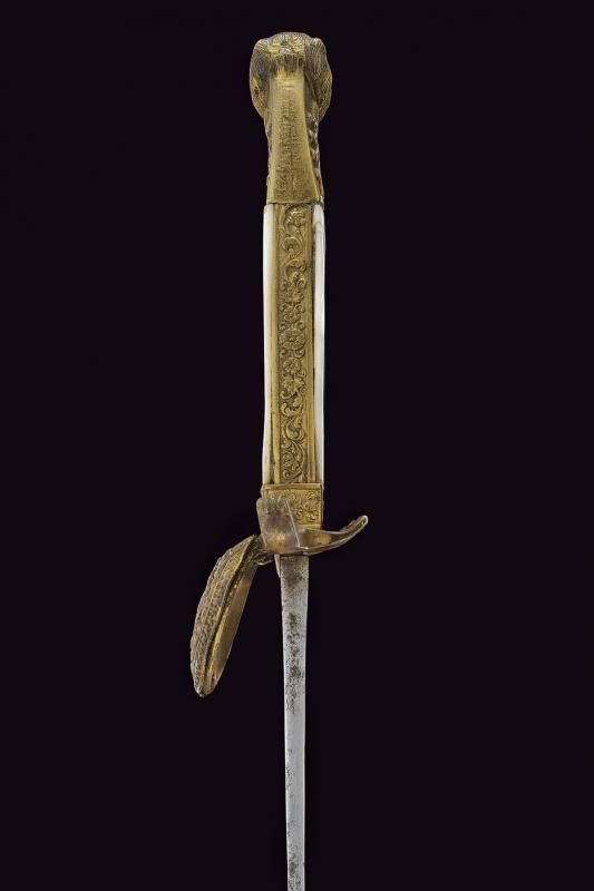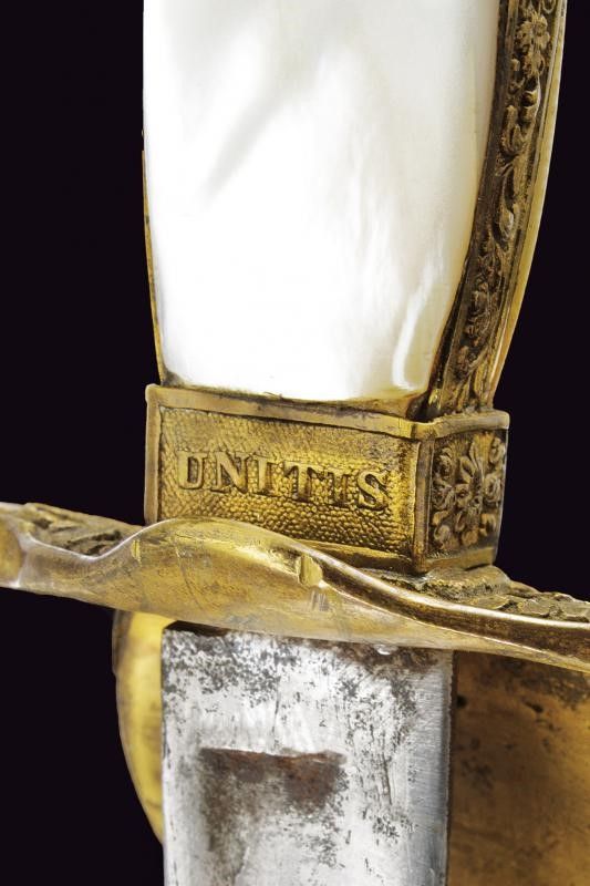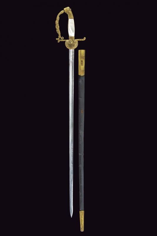 lunghezza 89 cm. Fine del XIX Secolo Lama dritta sgusciata (intaccature e segni di pulizia). Fornimento in ottone con pelta recante l'aquila imperiale austriaca in rilievo, guardia lavorata a serpente intrecciato con fronde di quercia, ghiera con il motto 'VIRIBUS UNITIS'. Guancette in madreperla (qualche crepa sul retro). Pomo a testa di leone. Fodero in cuoio (diffetti e piccoli danni) con fornimenti in ottone recanti resti di doratura.