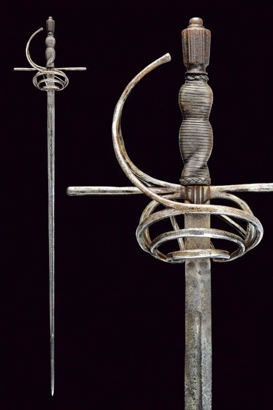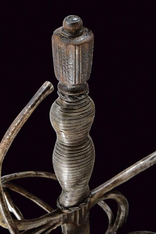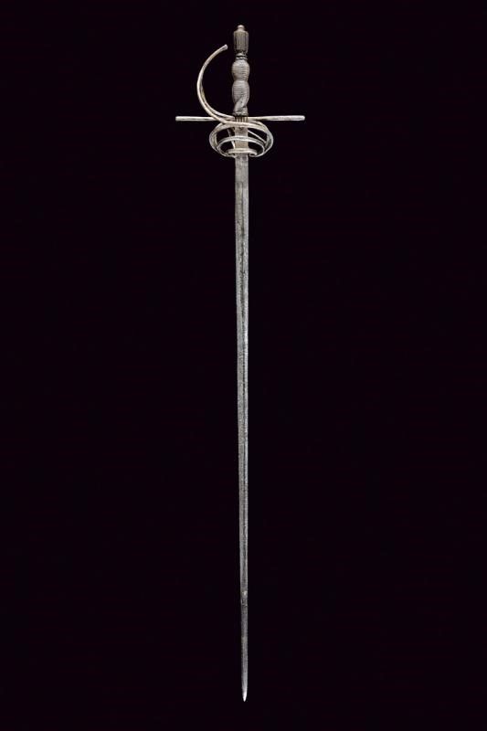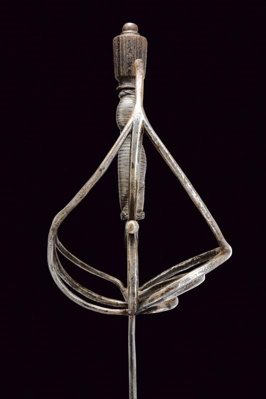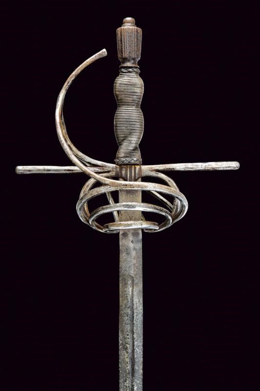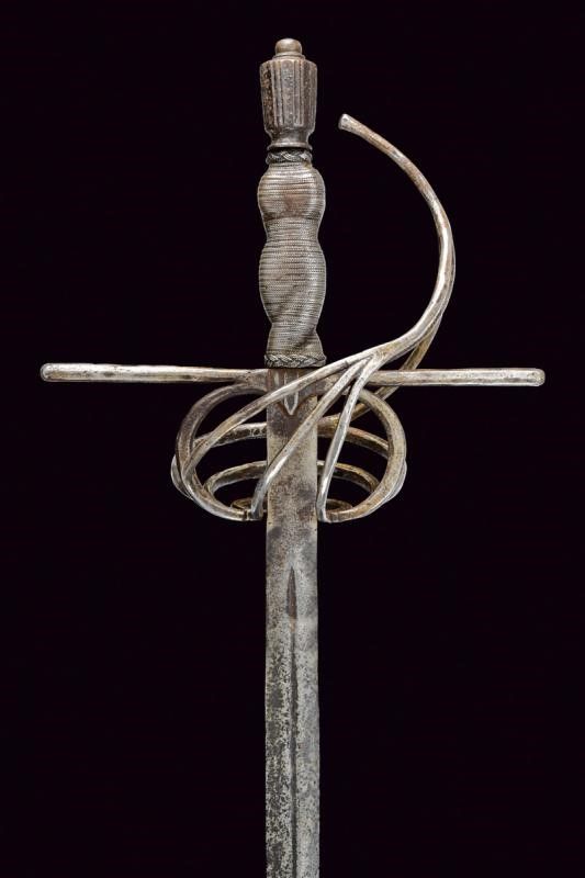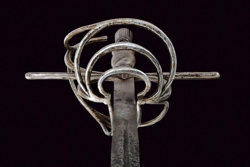 altezza 141,5 cm. Lunghissima lama di sezione lenticolare con varie intaccature. Elso in ferro a tre ponti e a tre rami di controguardia nello stile dell'inizio del XVII secolo. Bella impugnatura a decoro tortile rivestita con trecciola e dotata di teste di moro. Pomo a tino scanalato. Composita, forse con qualche elemento più antico.