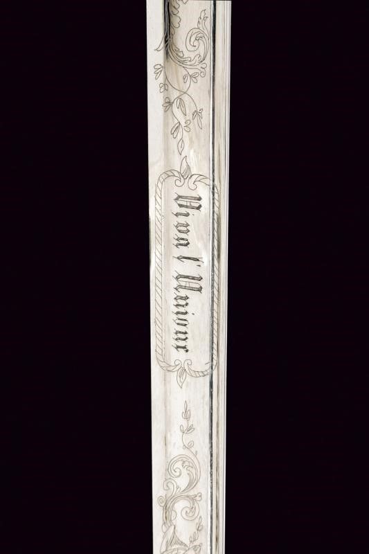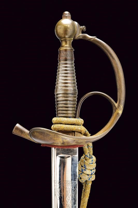 lunghezza 102 cm. Secondo quarto del XIX Secolo Lama dritta con sottile scanalatura accanto al dorso e doppio sguscio in punta, ornata con motto 'Viva l'Unione', racemi e trofei. Fornimento in ottone con coccia a cuore, guardia, anello di presa. Impugnatura in lamina metallica. Pomo con grande bottone. Fodero in ferro (non regolamentare) a due campanelle. Dragona in canutiglia dorata.