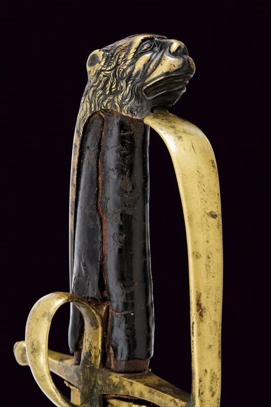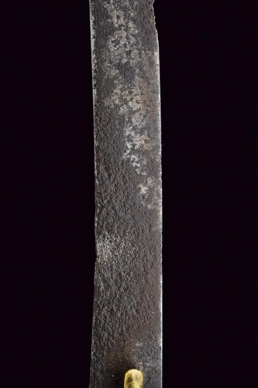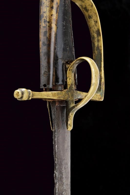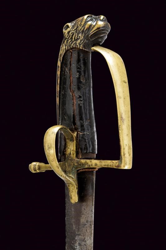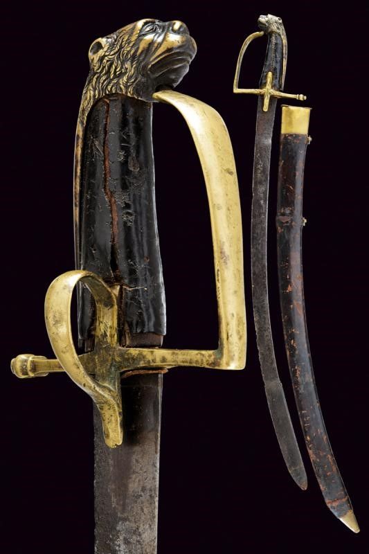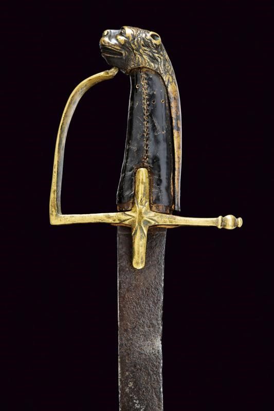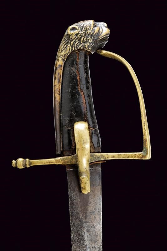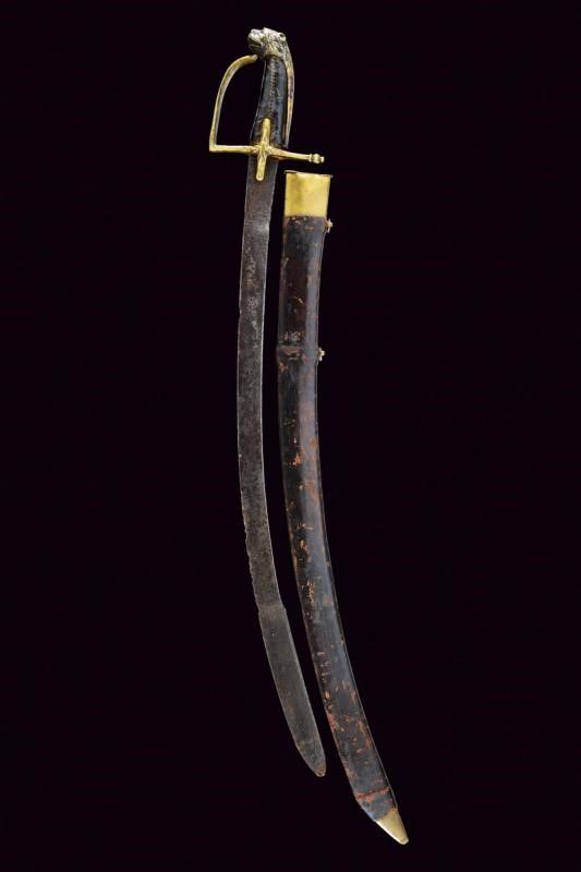lunghezza 88 cm. XVIII Secolo Lama piatta curva a un filo e controfilo, con forti danni da ruggine. Fornimento in ottone con alette fermafodero, anello da pollice sul lato posteriore, pomo a testa di leone ed impugnatura in legno con resti di rivestimento in cuoio. Completa di fodero in legno rivestito di cuoio e fornimenti in ottone, due anelli di sospensione.