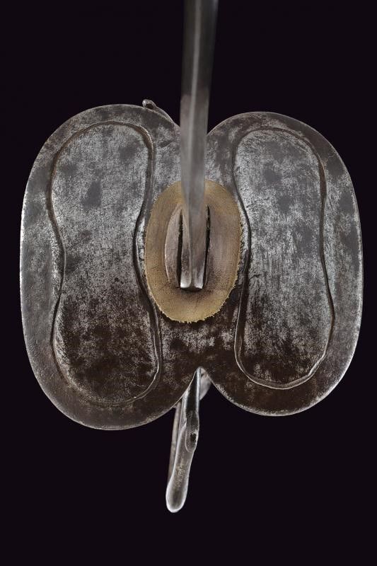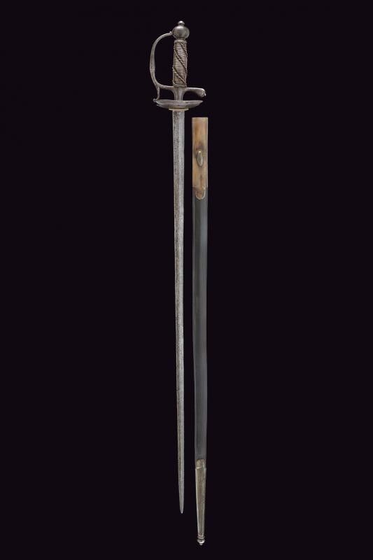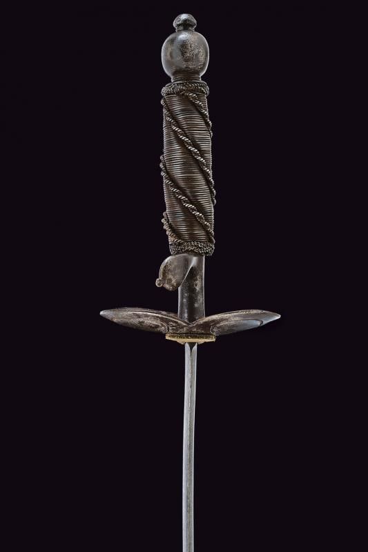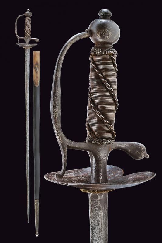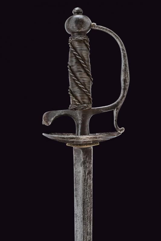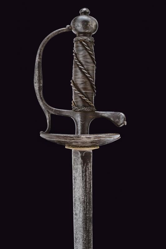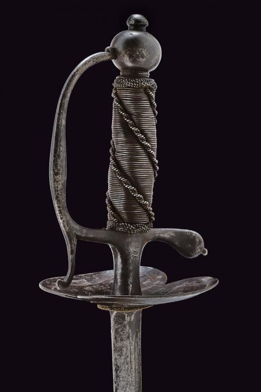 lunghezza 94 cm. Lama dritta a un filo e controfilo, di sezione lenticolare. Interessante fornimento in ferro, di tipologia non comune. Coccia a due valve delineate. Blocchetto spesso e tondeggiante a rivestire il ricasso dalla cui base parte il ramo di parata, palmato e bottonato, e quello di guardia, il quale, al posto degli archetti reca un riccio di protezione che si allunga verso la coccia. La guardia leggermente ingrossata al centro. Pomo sferoide schiacciato e bottonato. Impugnatura con rivestimento in bandella e trecciole di ferro. Sottili teste di moro. Fodero in cuoio (di restauro) con fornimenti in ferro probabilmente antichi.