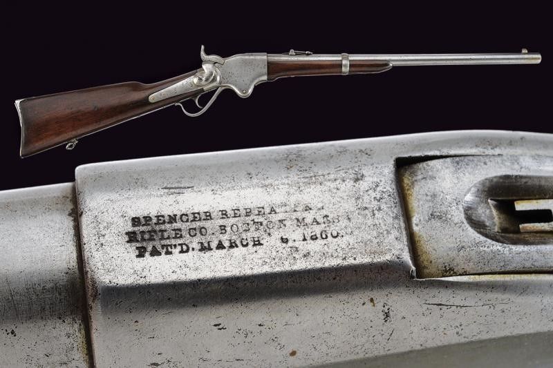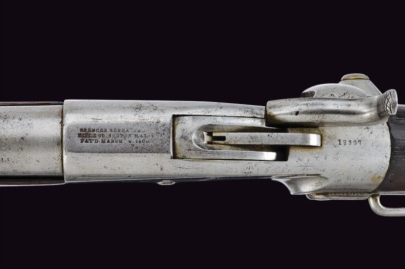 USA, lunghezza 99 cm. 1863 - 1865 Canna tonda da 22', a sei rigature, dotata di alzo abbattibile e regolabile, cal. 52 rimfire. Anima pulita, rigatura visibile, qualche intaccatura all'interno. Castello in ferro recante al dorso la dicitura della ditta di Boston e il brevetto del 1860. Otturatore a blocco cadente. Meccanica funzionante.Calcio ed astina in noce apparentemente senza timbri d'ordinanza ma con segni d'uso e del tempo. Fornimenti in ferro. Punzone 'J' sul castello. Matricola '18xxx'. Calciolo con serbatoio estraibile. Anello da sella.