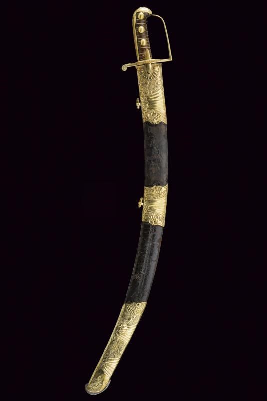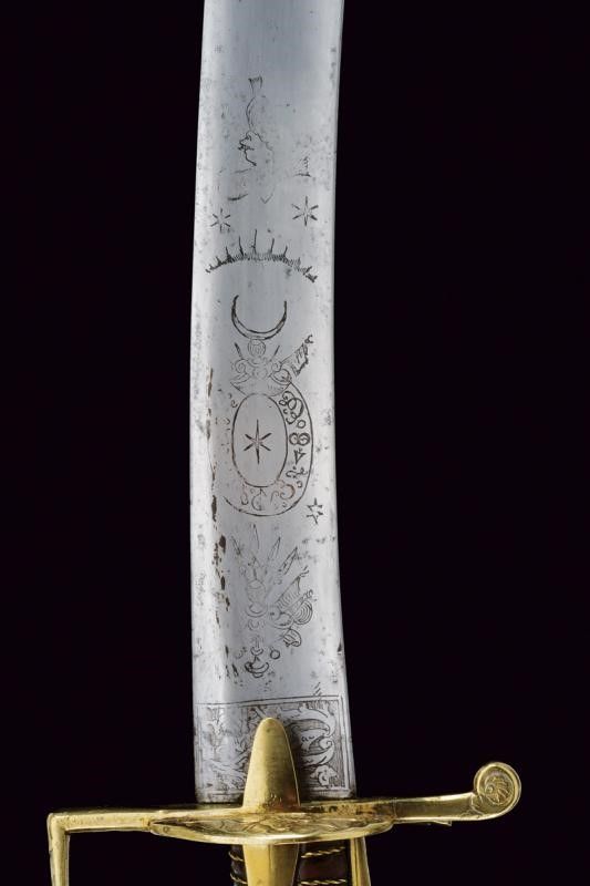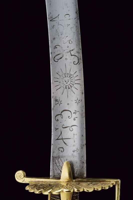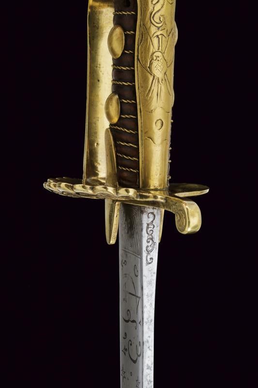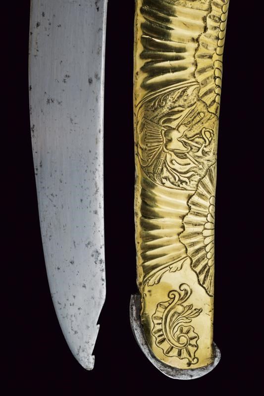 1740 - 50 Imponente e larga lama a un filo e controfilo, con lieve sguscio; la punta con due denti; la base incisa a trofei, con sole, stelle, luna, testa di pandur e simboli cabalistici; il dorso inciso a riccioli. Monumentale fornimento in bronzo dorato; l'elso munito di alette fermafodero e due valve finemente decorate a trofei in bassorilievo su fondo granulato; il largo ramo di guardia decorato a palmette; il pomo decorato en suite con il ramo di guardia, il lungo dorso della cappetta con trofei. Impugnatura in legno rivestita di cuoio, con trecciola in filo d'ottone, su entrambi i lati tre rivetti convessi, sempre in ottone. Fodero in legno rivestito di cuoio (mancanze) con tre fornimenti in ottone dorato, magistralmente incisi a trofei, rocaille e con scanalature. Due grandi anelli di sospensione, vela in ferro. Arma rarissima e di gran qualità, estremamente rara da trovare in queste dimensioni e con lavorazione di coś gran pregio.