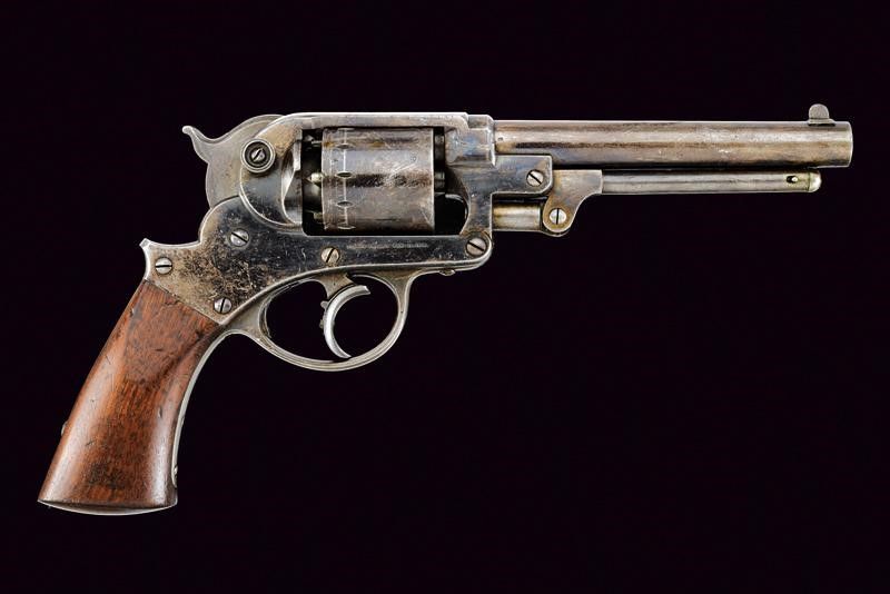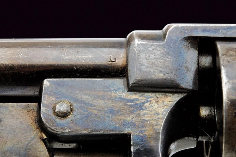 USA, lunghezza 30 cm. 1850/60 Canna cilindrica rigata dotata di mirino, punzonata 'C' e 'L' alla base, cal. 44. Anima pulita, rigatura visibile. Tamburo liscio a sei colpi. Meccanica a doppia azione funzionante. Matr. '13xxx' visibile sui due elementi del castello e sul tamburo. Resti di brunitura color blu antica (circa al 60%). Marcatura della ditta e del brevetto sui fianchi del castello. Punzoni 'C'. Impugnatura liscia in noce con timbri d'ispezione militare.