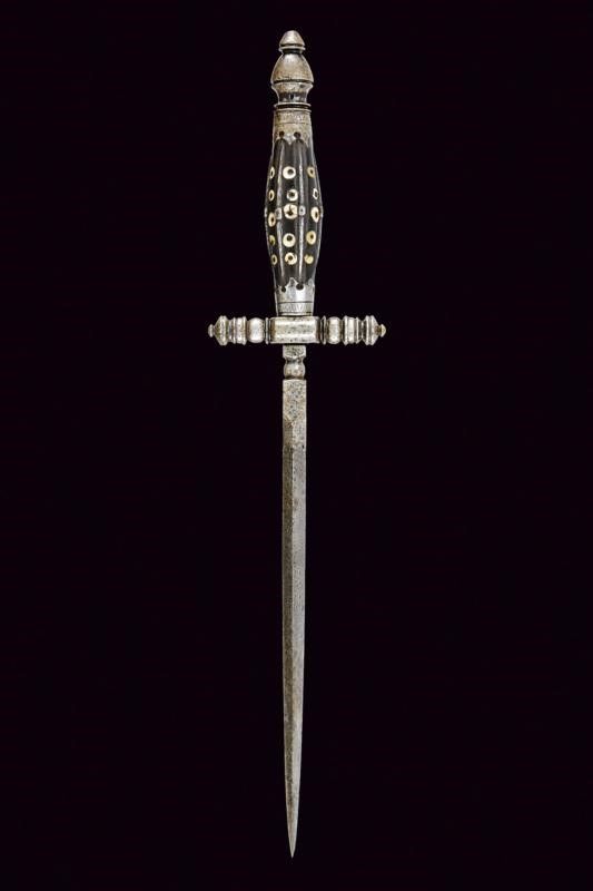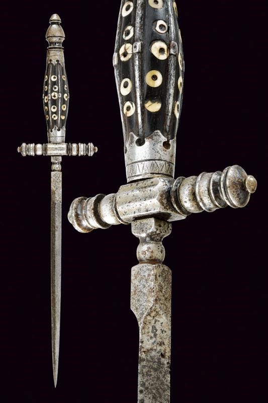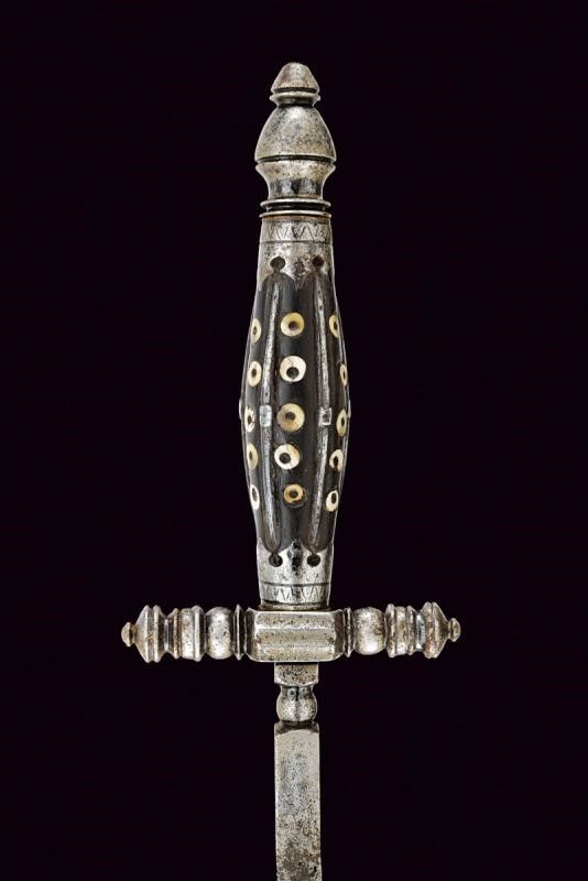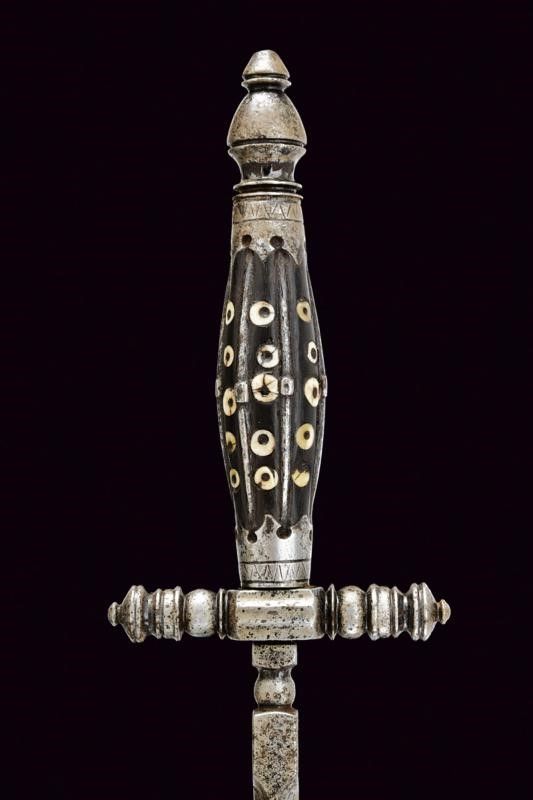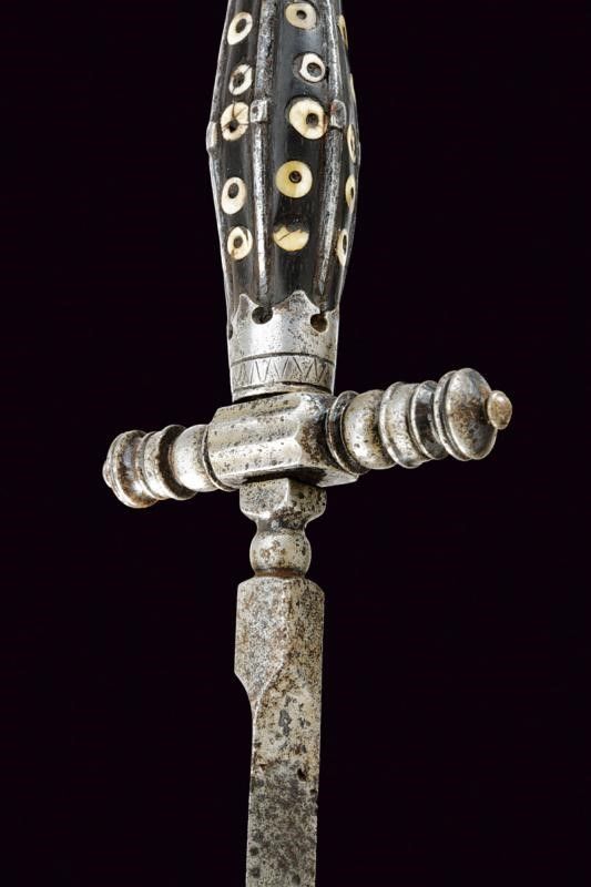 lunghezza 40,8 cm. Lama dritta di sezione triangolare con tallone quadro, il collo con nodo sferoide. Riparazione alla base della lama. Crociera in ferro con bracci riccamente lavorati a torniture con nodi e dischi, bottonati in testa. Massello a parallelepipedo modanato. Impugnatura in legno ornata con 'occhi' in osso, rinforzata con doghette e con ghiere intagliate alle estremità. Pomo ogivale con grande bottone.