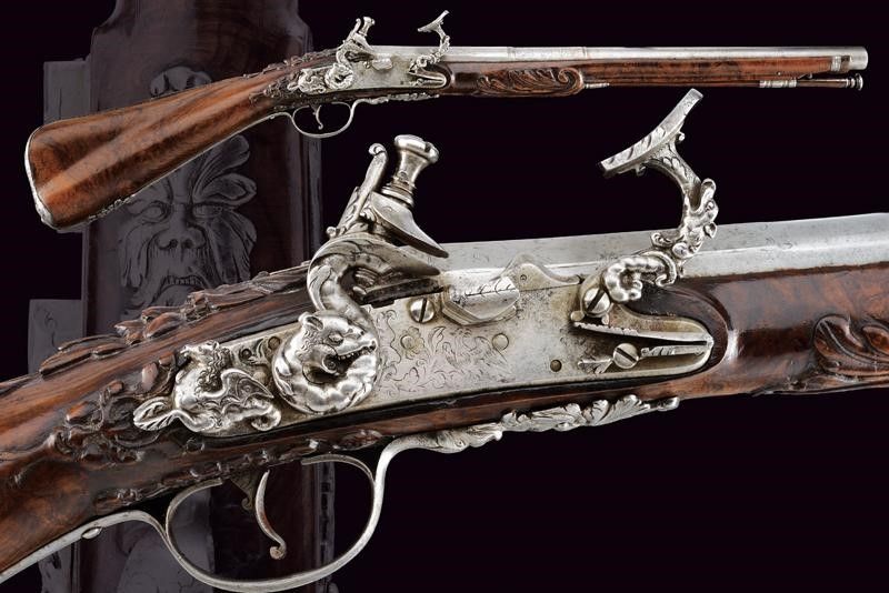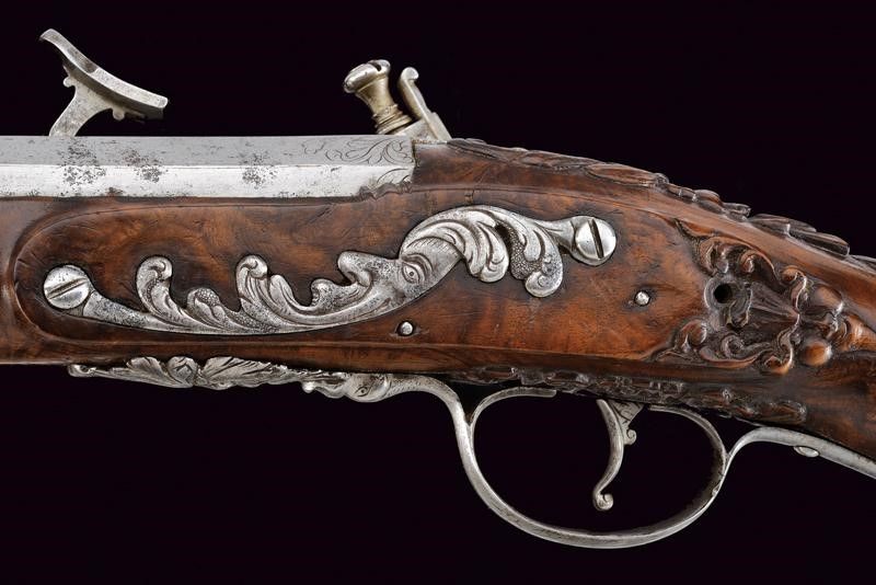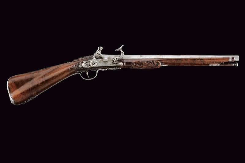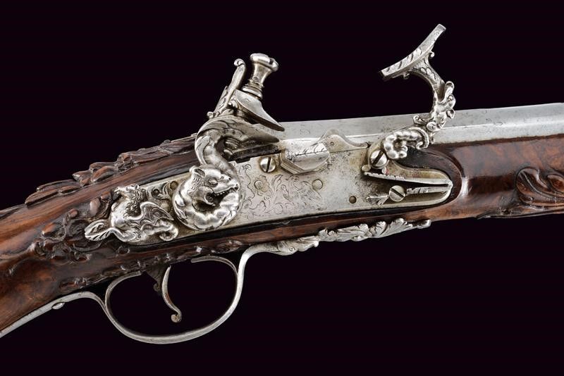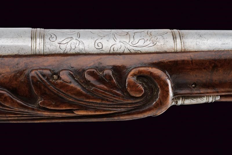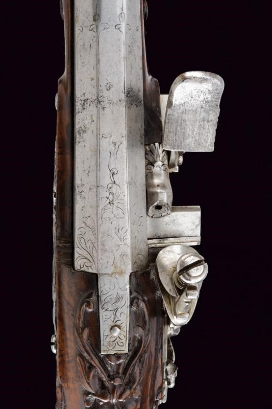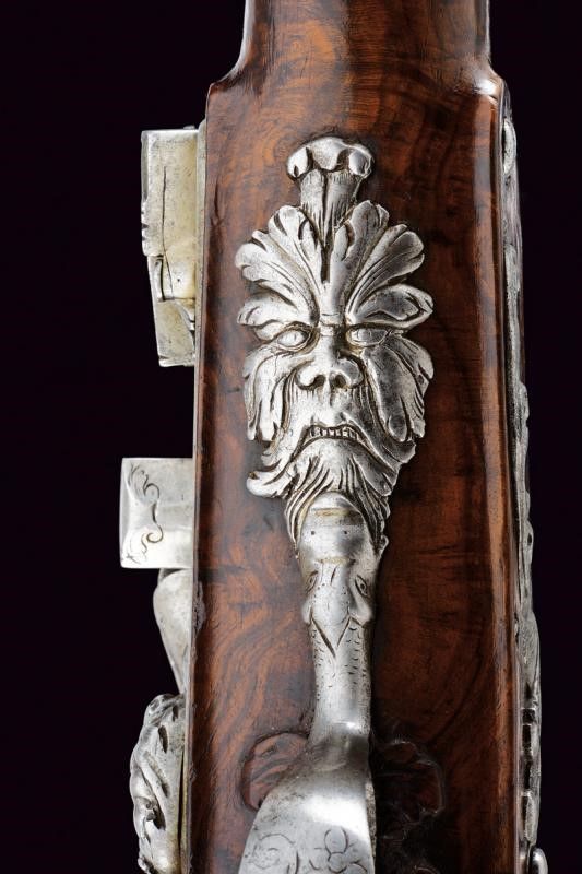 Canna liscia a quattro ordini; la prima parte ottagonale incisa a motivi floreali, poi un segmento a sedici facce, gli ultimi due tratti tondi, il primo inciso con due personaggi fra decorazioni floreali, il secondo liscio, in calibro 20 mm in volata. Codetta incisa. Batteria alla fiorentina con lunga cartella piatta dotata di bordi obliqui, incisa con un rapace e decori floreali, munita di coda con raffigurazione di un pegaso in altorilievo, cane e martellina (nella parte interna una profonda crepa) a forma di draghi intagliati in rilievo; il copriscodellino scorrevole. Cassa intera (piccoli restauri, probabilmente eseguiti in epoca d'uso) in radica, scolpita con fantastici mascheroni e fiorami in rilievo. Fornimenti in ferro con intagli raffiguranti grandi mascheroni, quello di dimensioni maggiori copre tuto il calciolo ed ha bocca spalancata dalla quale esce la lingua, la contropiastra con profilo a mascherone e motivi floreali. Il ponticello inciso con una personaggio e dotato di codolo anteriore lavorato a testa di serpente intenta a mordere un mascherone. Bacchetta in legno con battipalla e cavastracci in ferro.