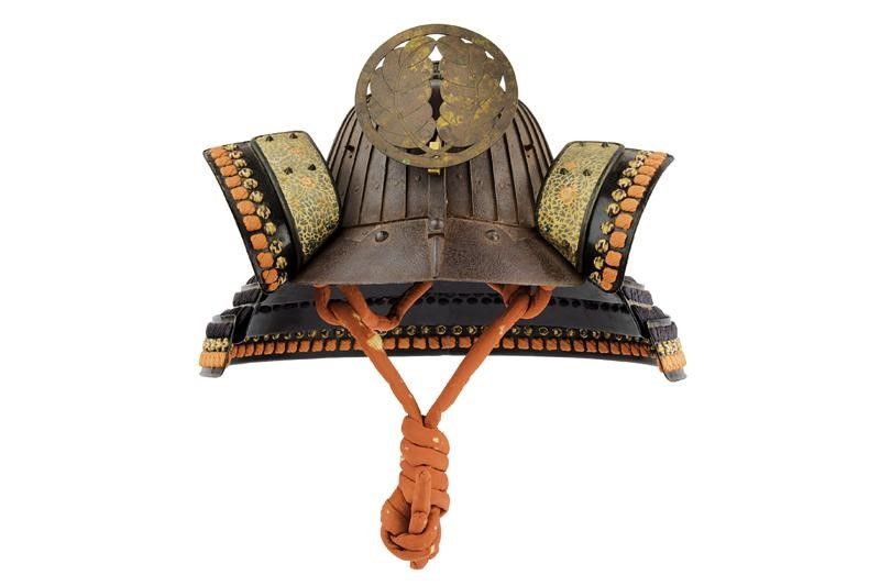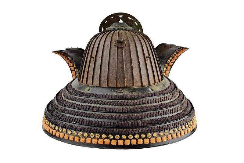 altezza 26 cm. Periodo Edo (1603-1867) Hachi costituito da trentadue piastre in ferro con finitura color ruggine. Hachimanza alla sommità. Kasa-jirushi-no-kan sul retro. Mabizashi con tre rivetti e uno Tsunomoto, rifiniti in lacca nera nella parte inferiore. Ampi Fukigaeshi decorati con Egawa, Uname colorato e Hishinui scarlatto. Shikoro a quattro piastre con allacciatura color blu, Uname e Hishinui en suite con i Fukigaeshi. Interno con Ukebari e Shinobi-no-o . Maedate in ottone 'Maru-ni-dakikashiwa-mon'.