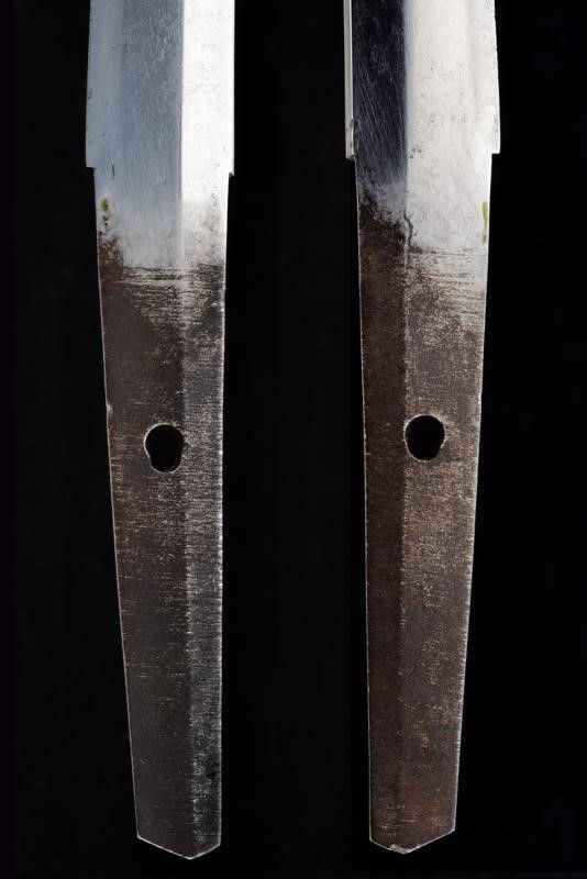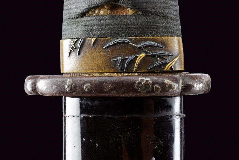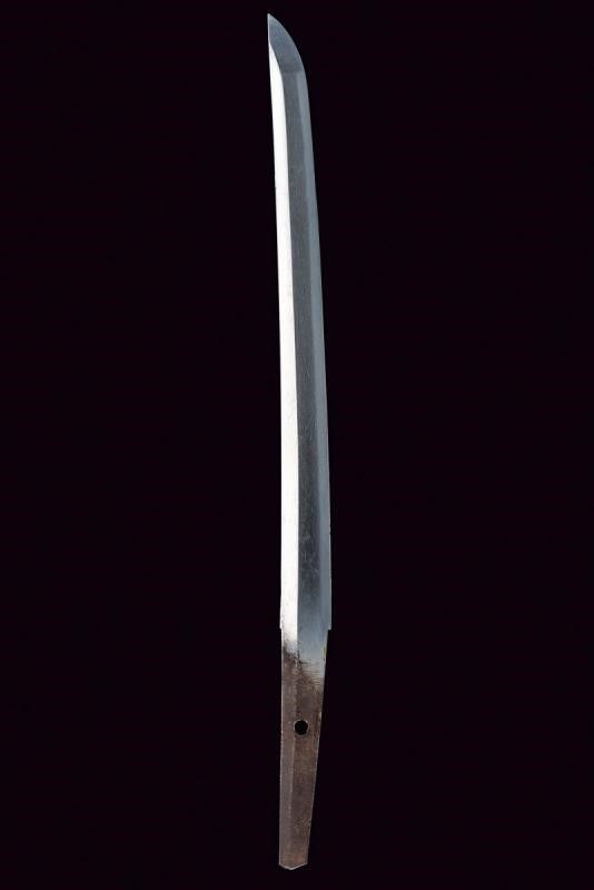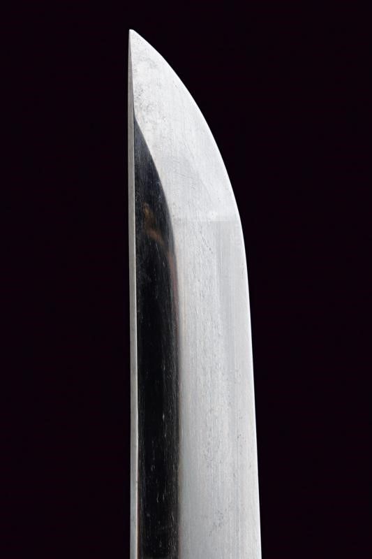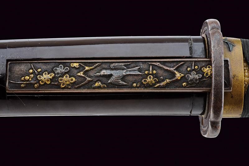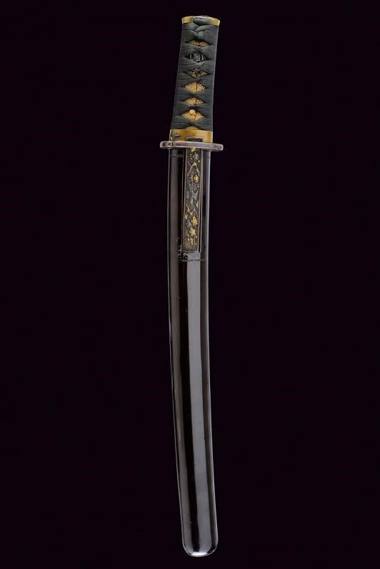 lunghezza 40 cm. Periodo Shinshinto (1781-1876) Lama con nagasa di 27.3 cm; hamon: suguha, hada: masame. Nagako mumei con un mekugi-ana. Habaki in rame argentato. Koshirae con tsuba in ferro di forma mokko e con bordo decorato a motivi floreali rimessi in argento. Fuchi con erbe in bassorilievo, kashira con un volatile tra erbe. Completo di menuki. Saya in legno laccato nero. Kozuka in rame decorato con volatile, rami e fiori parzialmente dorati.