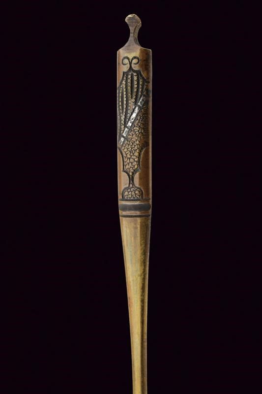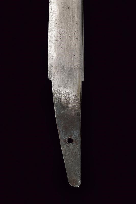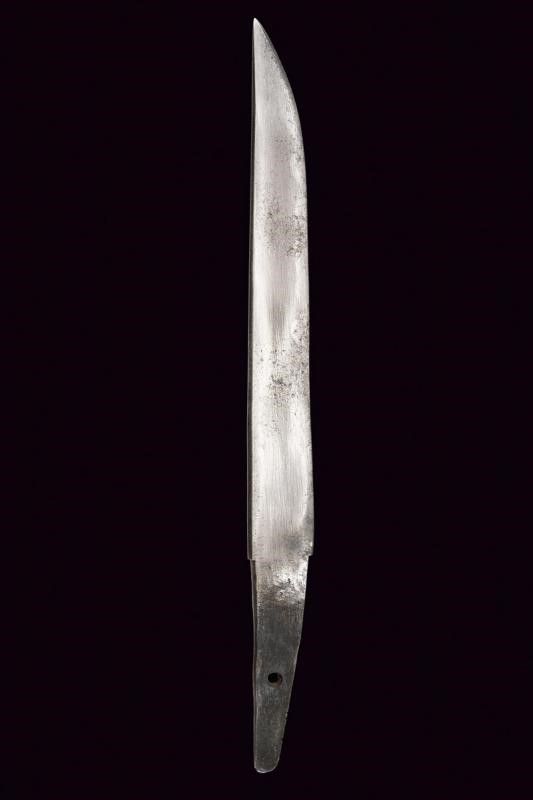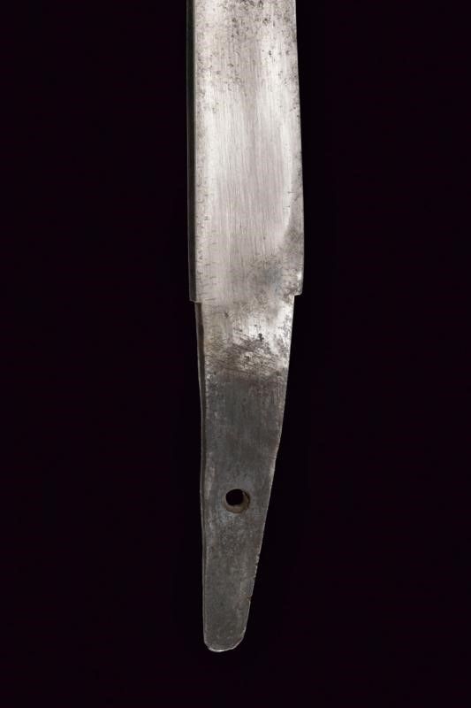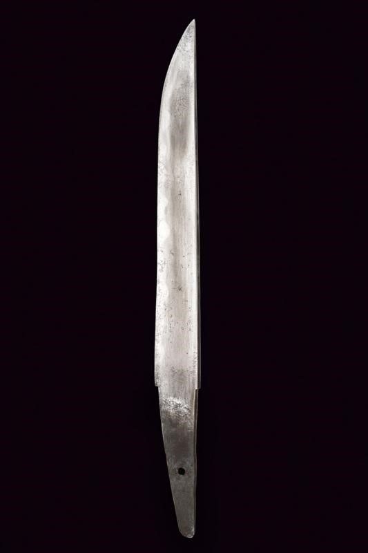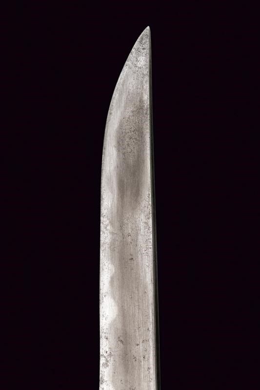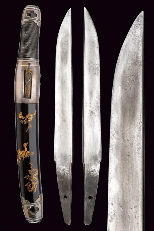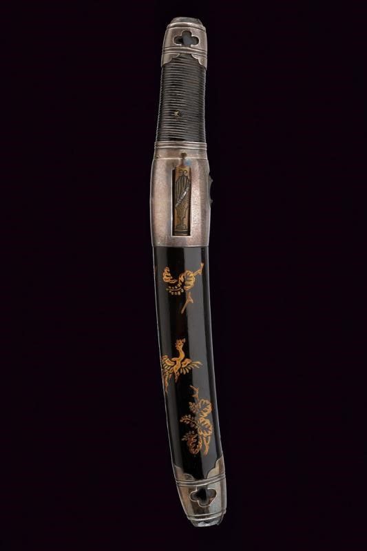 lunghezza 25.5 cm. Periodo Meiji (1868-1912) Lama di forma hira-zukuri (Nagasa 16.2 cm); hamon: gunome midare; hada non visibile; habaki in rame. Koshirae decorato con urushi, fenice e paulonia; fornimenti in argento, due kogai in ottone (uno con incisioni). Saya con due mancanze. Fine del XIX secolo.