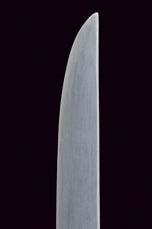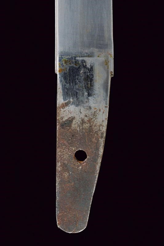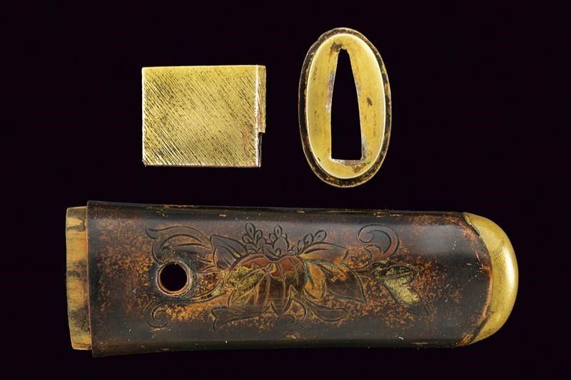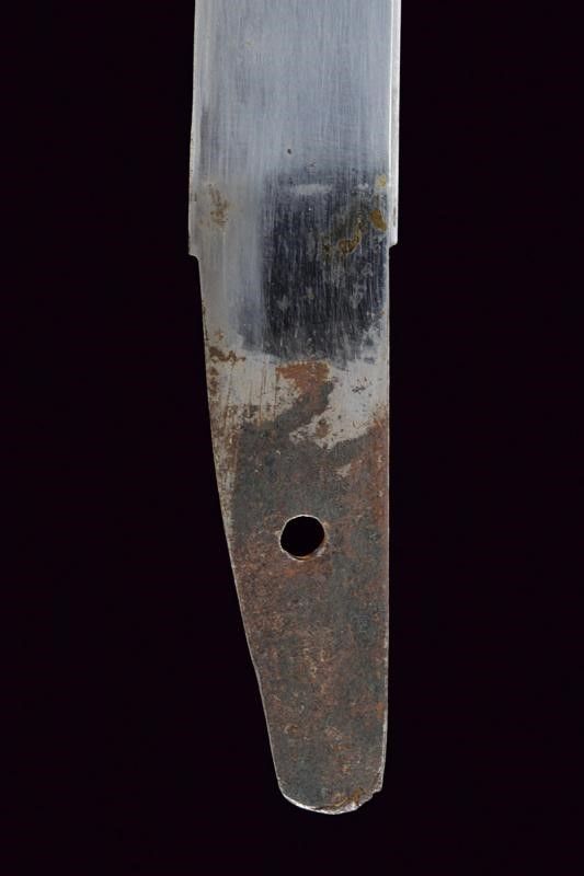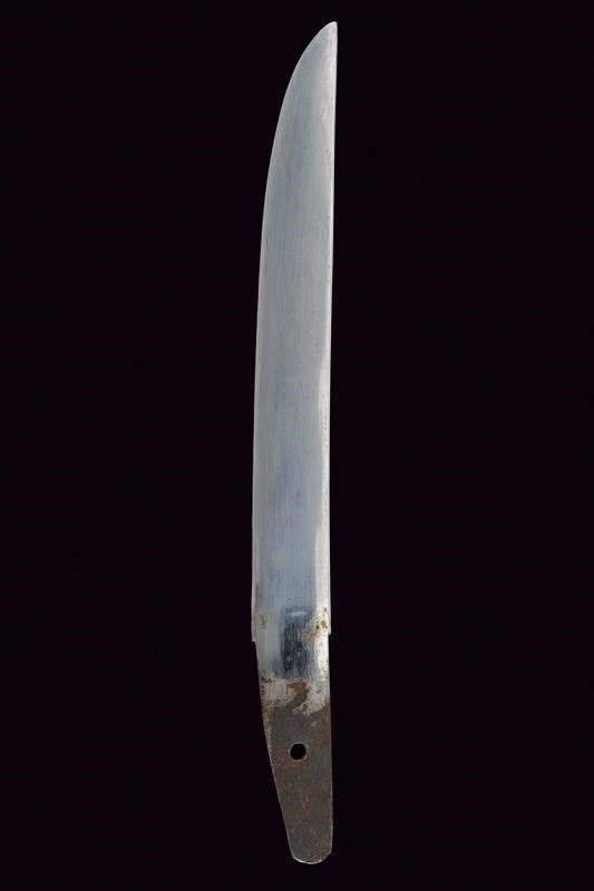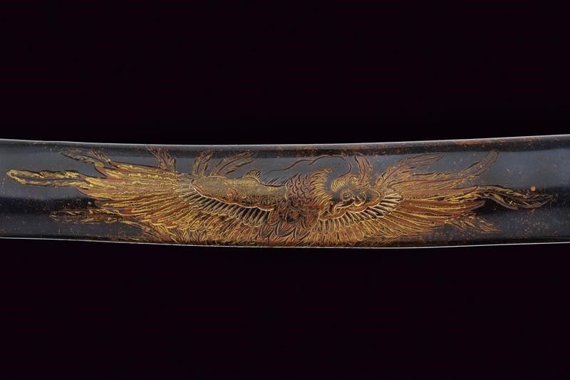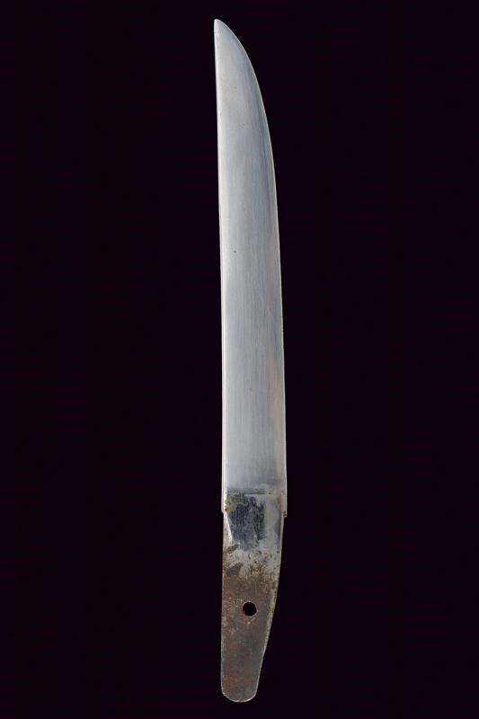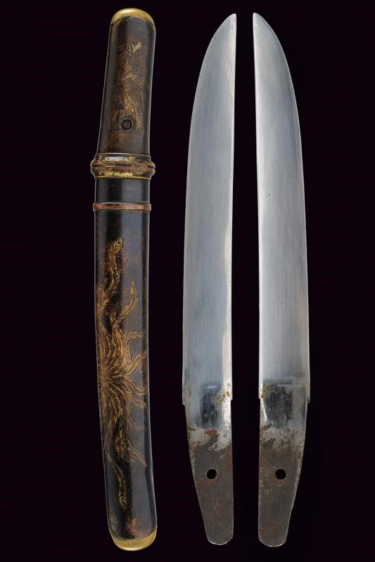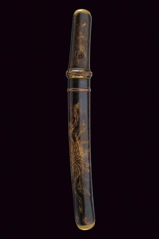 lunghezza 27 cm. Periodo Meiji (1868-1912) Lama di forma hira zukuri (Nagasa di 17.2 cm) con hamon e hada non visibili. Nakago mumei con un mekugi-ana. Habaki in rame dorato. Koshirae in lamina di ottone incisa con hoho (fenice) e decori floreali. Fine del XIX secolo.