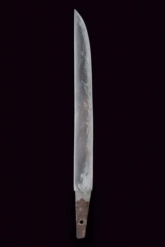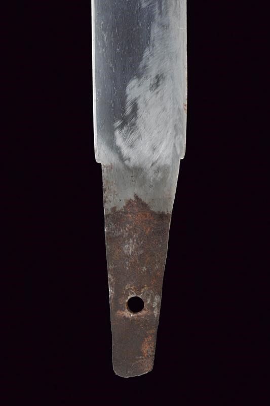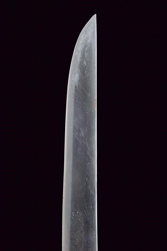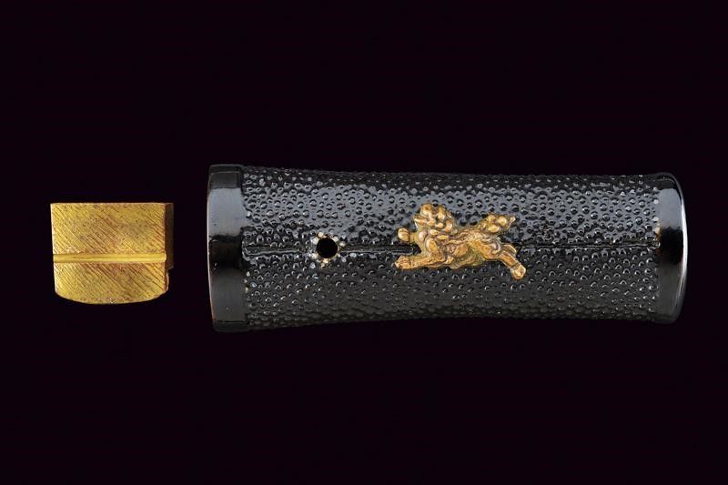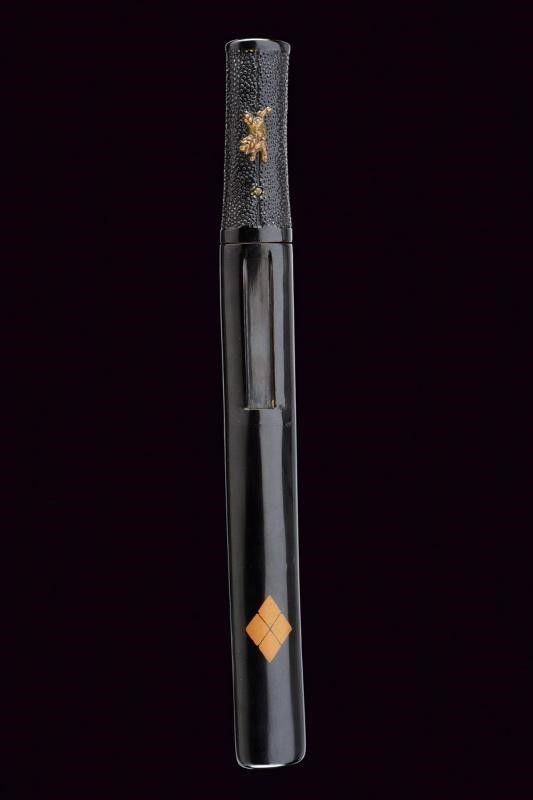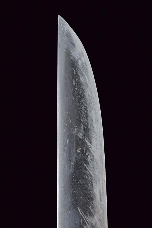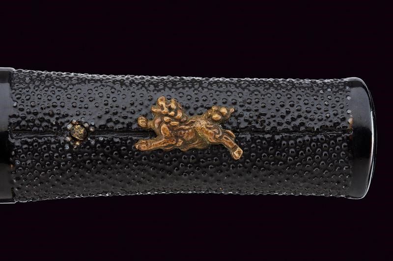 lunghezza 37 cm. Periodo Edo (1603-1867) Lama (Nagasa di 25 cm, con imperfezioni) con hamon e hada non visibili. Nagako mu-mei con un mekugi-ana. Habaki in rame dorato. Tsuka in legno con dezamegawa laccato nero (avvolto in pelle di razza). Menuki in rame a forma di leone. Saya laccata di nero con mon dorato della famiglia Takeda-Bishi.