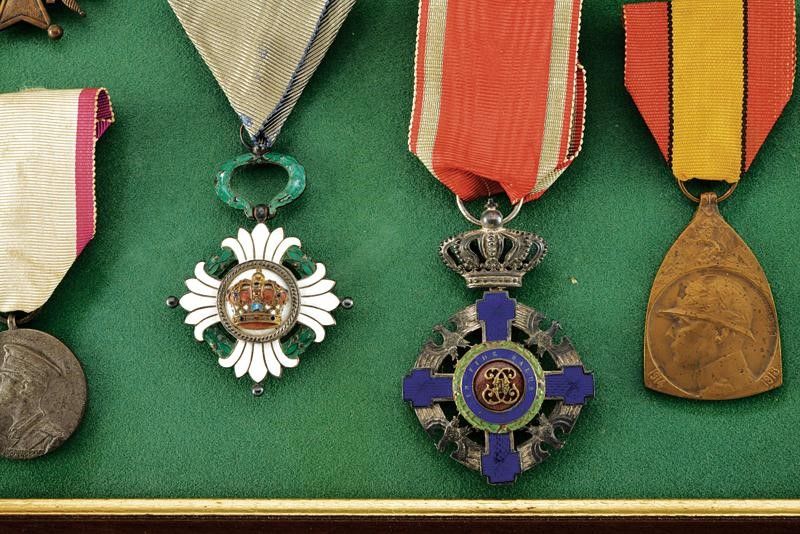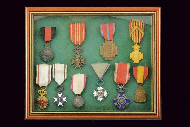 dimensioni various cm. primo quarto del XX Sec. Cinque decorazioni del Belgio, tre della Romania, di cui una croce da cavaliere della stella di Romania (seconda classe) e una medaglia al merito per la cultura (la terza con mancanza al centro), una croce da cavaliere dell'ordine delle tre stelle (Lettonia), croce di cavaliere dell'ordine della corona (Jugoslavia). In teca moderna, in legno e sotto vetro.
