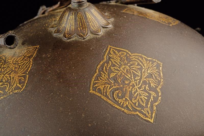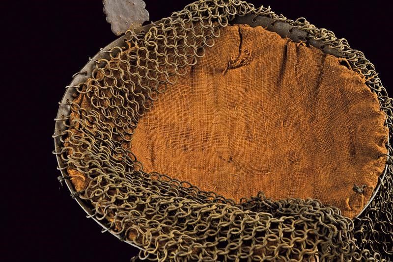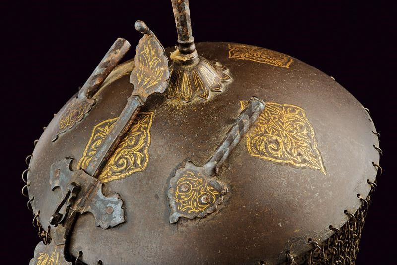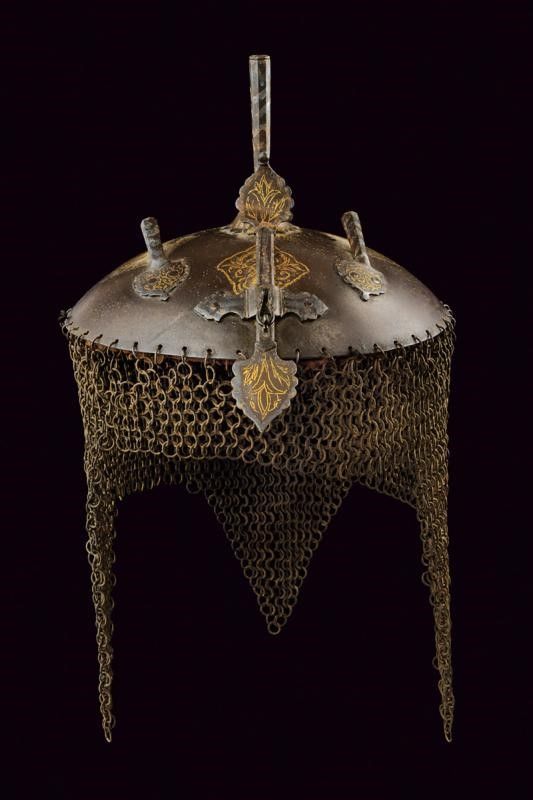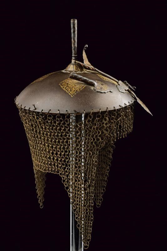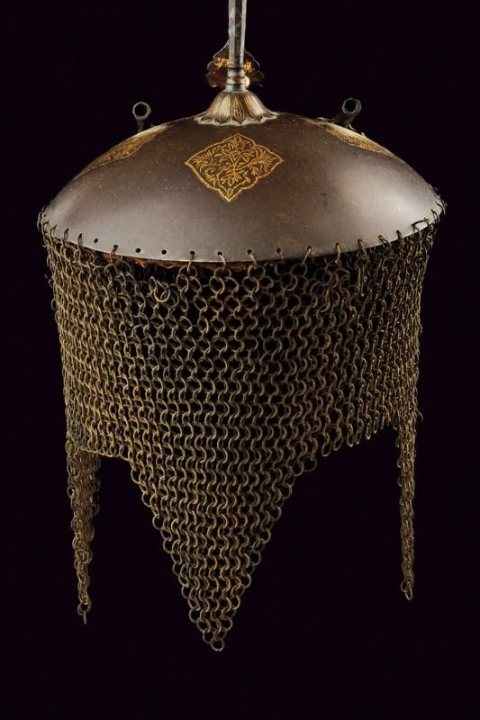 altezza about 30 cm. Fine del XIX Secolo Coppo circolare convesso, la sommità con pennacchiera su base a fiore, sul frontale il nasale scorrevole, fra due pennacchiere. La superficie con cartigli e decorazioni floreali in oro. Camaglio costituito ad anelli con chiusura semplice, lavorato a tre frange. L'interno con fodera originale.