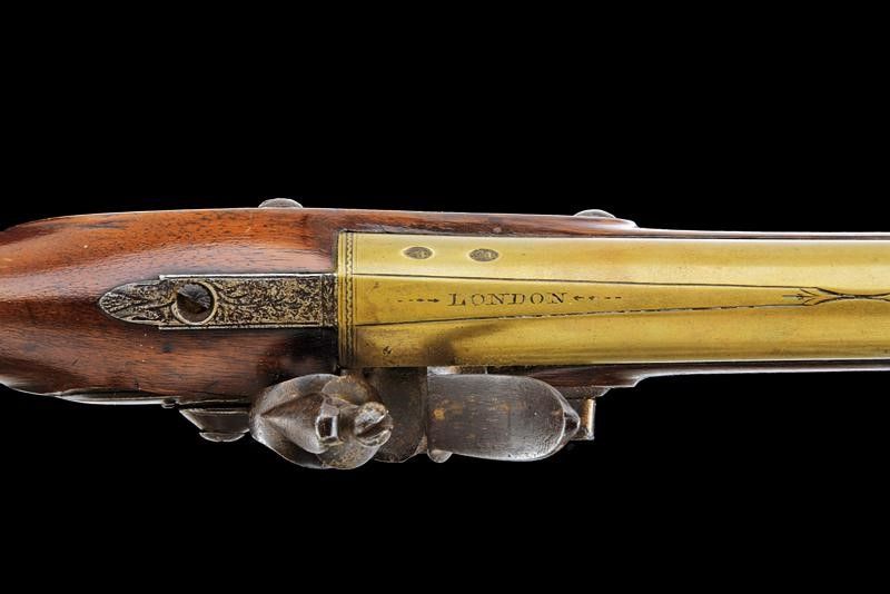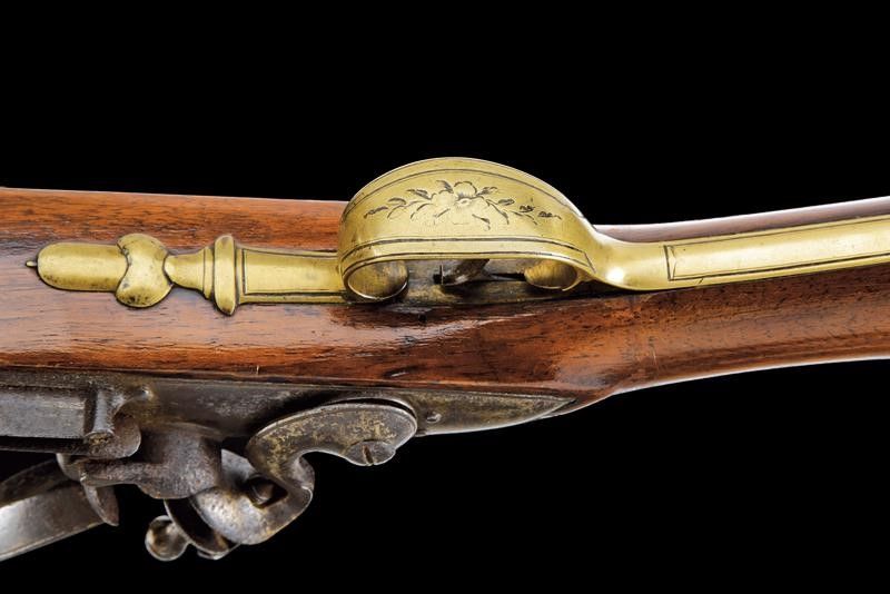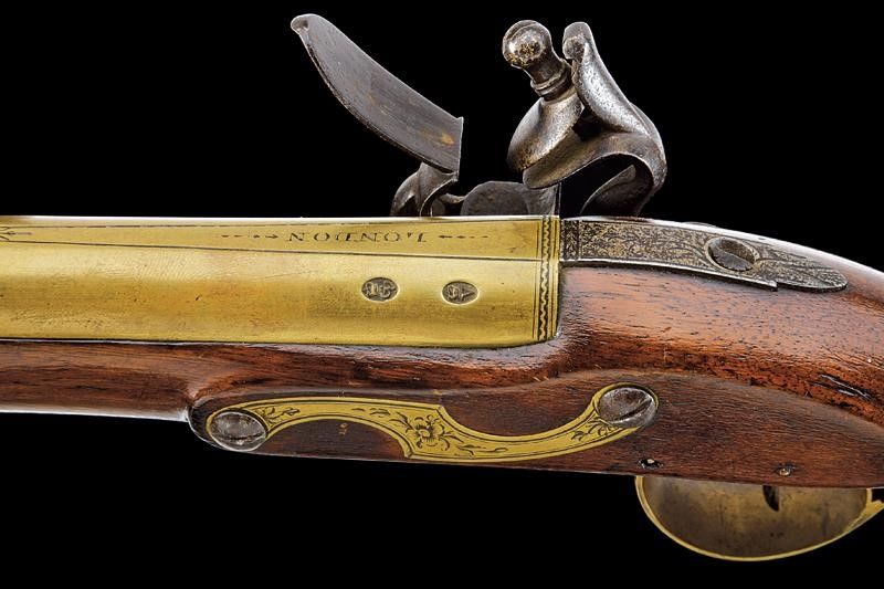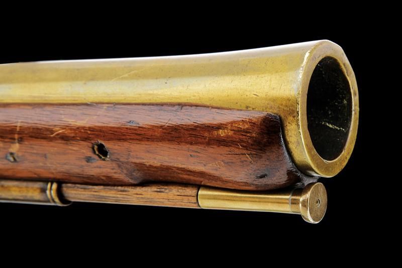 lunghezza 79 cm. Canna liscia in ottone, con cornice alla culatta, marcatura 'LONDON' e con due punzoni del banco di prova di Londra, volata strombata e circolare. Codetta in ferro incisa, la vite spezzata. Batteria a pietra focaia con cartella tondeggiante firmata 'WILLIAMS'. Meccanica funzionante. Cassa intera in legno con fornimenti in ottone finemente incisi a motivi floreali. Bacchetta in legno con battipalla in ottone.