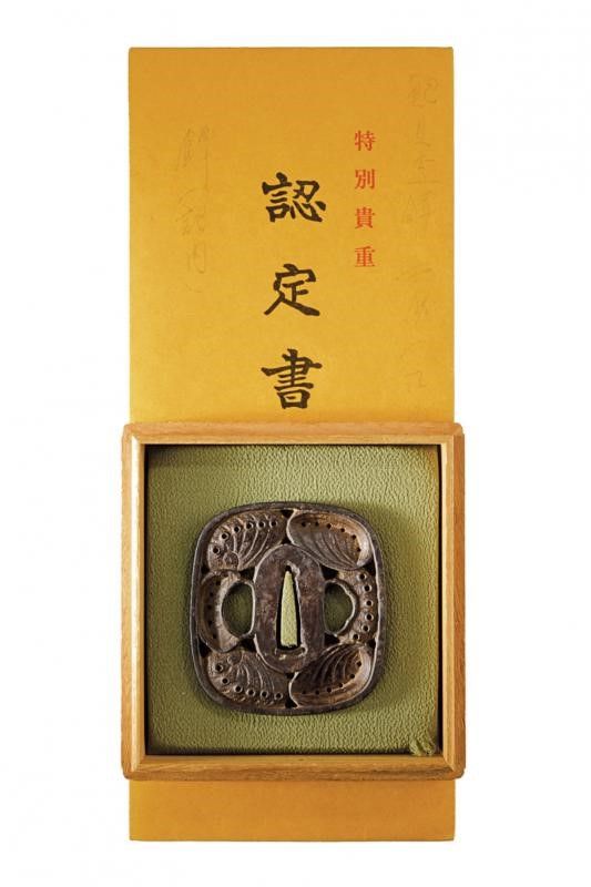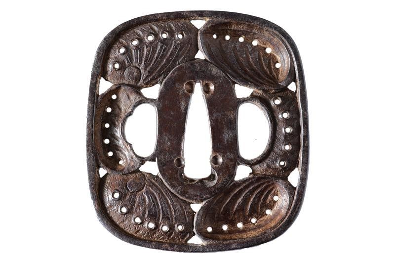 dimensioni 6.4 x 7 cm. Periodo Edo (1603-1867) In ferro, di forma nade-kaku-gata, decorata in sukashi-bori con disegno awabi (abalone), con resti di decorazioni in oro. Certificato NBTHK 'Tokubetsu Kicho', il quale conferma che la tsuba, pur non essendo firmata, è opera del maestro Kinai, che lavorava per tanti armaioli in Echizen. In kiri-box.