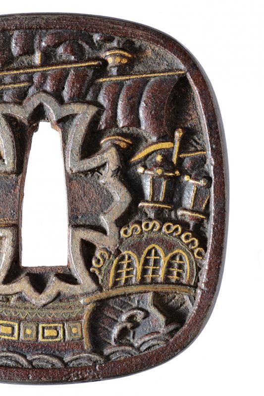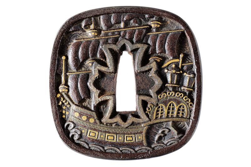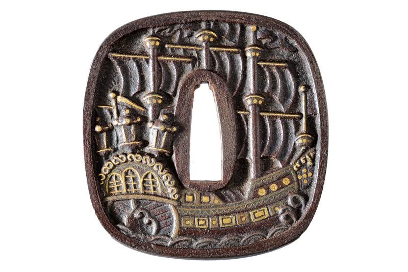 dimensioni 7.3 x 7.5 cm. Periodo Edo (1603-1867) In ferro, di forma nade-kaku-gata, per una katana. Recante effige nana-sen (nave a vela occidentale) e con decorazioni parzialmente rimesse in oro. Su un lato seppa-dai, ossia nella faccia posteriore della tsuba è presente la rara effige di una croce kakure Kirishitan (in quanto nel periodo Edo il cristianesimo era bandito come religione, in una parte del giappone, e sul lato seppa-dai il marchio rimane più nascosto). In kiri-box.