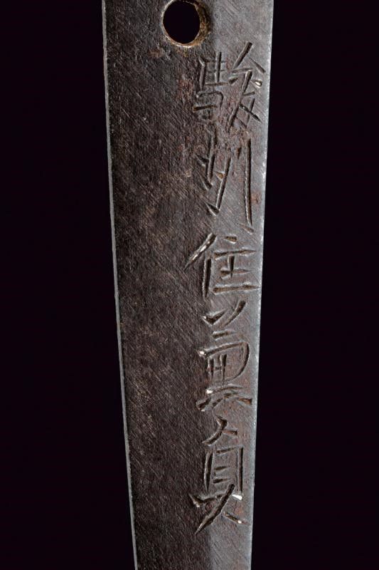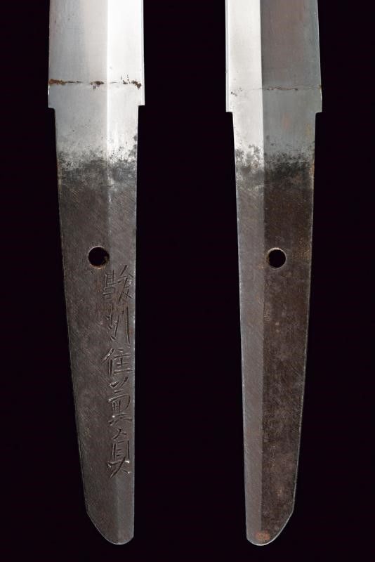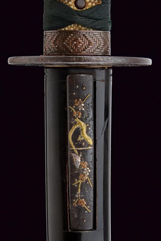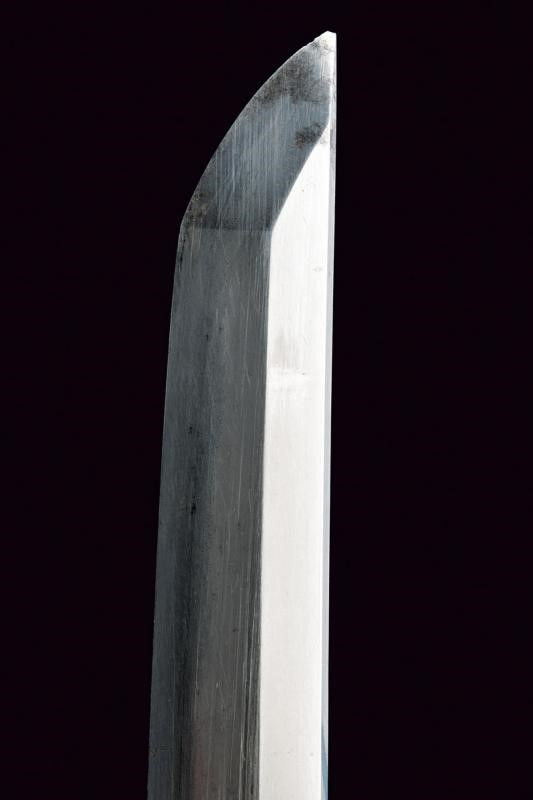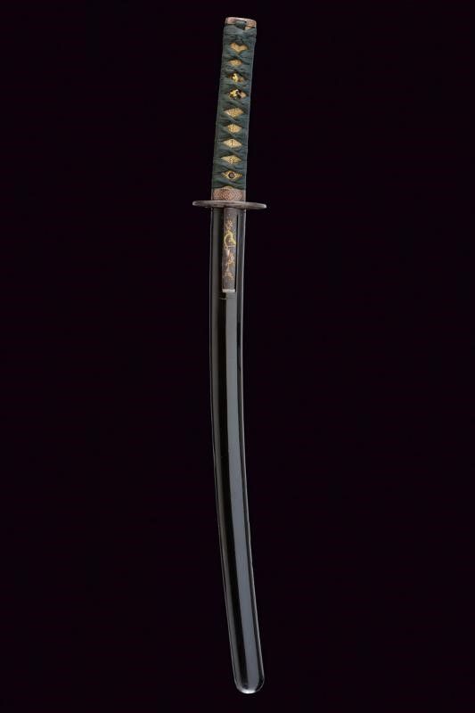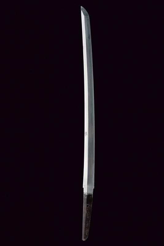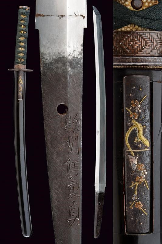 lunghezza 72.8 cm. Periodo Edo (1603-1867) Lama (Nagasa di 51 cm) di forma shinogi zukuri; hamon: notare con abbondante nie ara nie nijuba, hada: muji. Nakago mei: Sunshu-Ju-Kanesada Suruga Mino, un mekugi-ana. Doppio habaki in rame parzialmente dorato. Interessante koshirae, tsuba in ferro di forma maru-gata con sukashi a melanzana, il resto decorato a intreccio; fuchi e kashira in rame decorato con intreccio e puntini in argento; menuki in shakudo con uccelli in oro. Saya in legno laccato di nero, kozuka in ferro decorata a motivi floreali in oro, argento e shakudo. Periodo Kanbun Shinto, 1661.