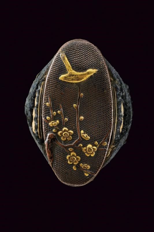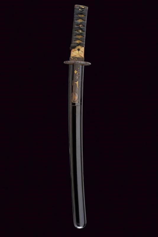 lunghezza 48.5 cm. Periodo Edo (1603-1867) Lama shinogi zukuri (Nagasa 33 cm); hamon: suguha; hada poco visibile; piccolissime intaccature al filo e zone con danni da ruggine sulla lama, che possono essere rimosse con una politura. Nakago mumuei con un mekugi-ana. Habaki in rame dorato. Koshirae con tsuba in ferro intagliato a motivi floreali, bei fuchi e kashira in shakudo, con uccelli e decori floreali rimessi in oro e argento, completo di menuki; mancanze allo tsuka-ito. Saya in legno laccato di nero (lievi mancanze alla finitura) con kozuka decorata con effige di un cervo e decori floreali parzialmente dorati. Inizio del XIX secolo.