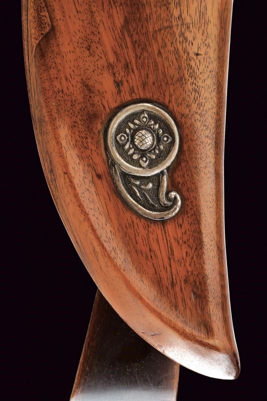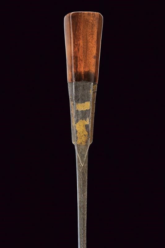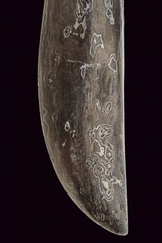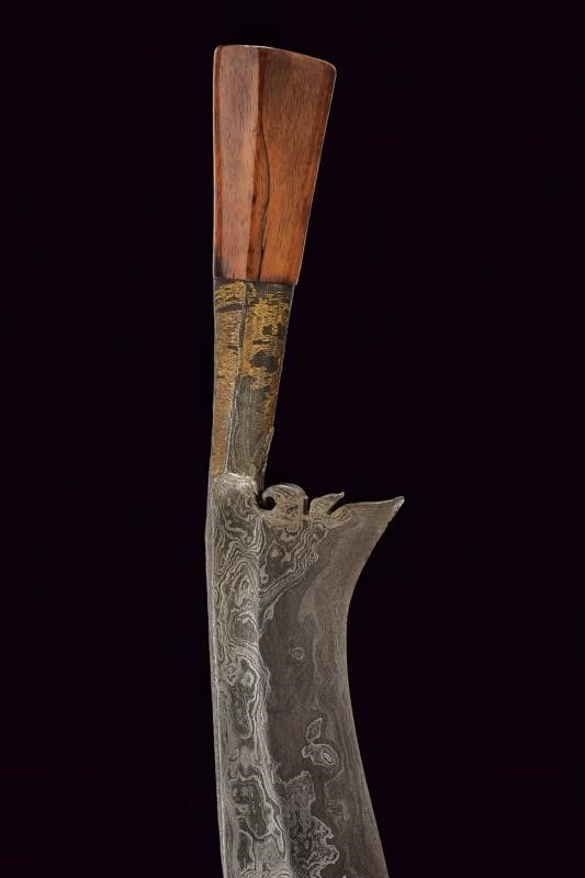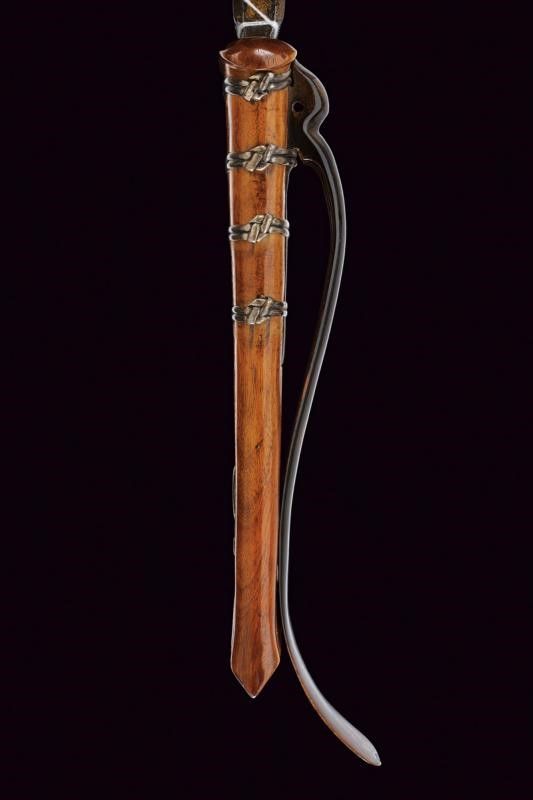 Sumatra, lunghezza 34 cm. XVIII Secolo Larga e robusta lama in finissimo pamor, a un filo, con base intagliata e dorso inciso. Tipica impugnatura con pomo in legno faccettato e base in pamor, sempre faccettata e con resti di doratura. Il fodero in legno, con gancio da cintura in corno e fornimenti in argento.