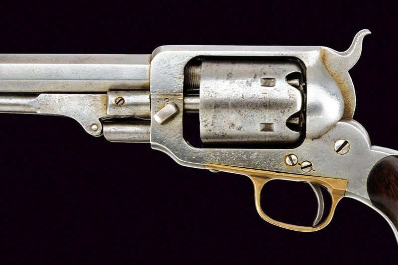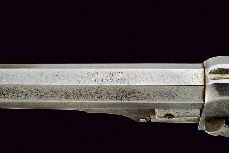 USA, lunghezza 33 cm. 1850/60 Canna ottagonale da 7-1/2' con mirino cilindrico in ottone, recante al dorso resti di marcatura in due righe 'E. WHITNEY / NEW HAVEN', cal. 36. Rigatura visibile, incrostazioni e pitting all'interno. Il calcatoio numerato '7xx'. Tamburo a sei colpi. Meccanica funzionante. Castello in ferro con ponticello in ottone. Guancette lisce in legno, numerate come il calcatoio.