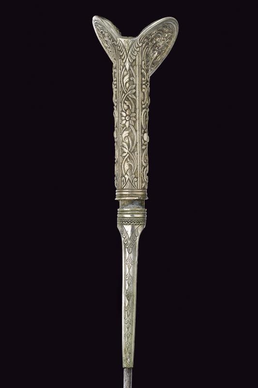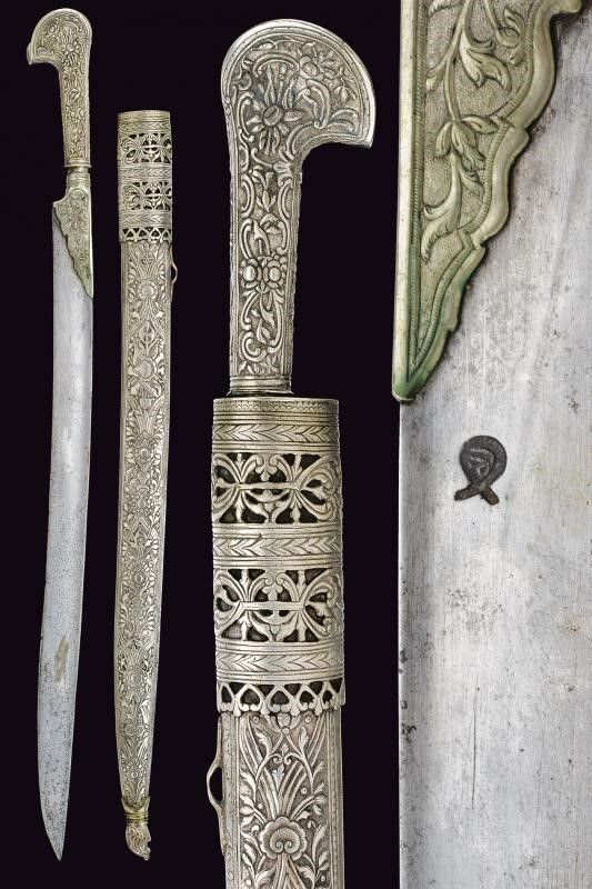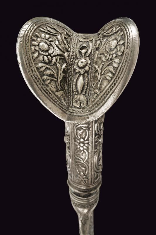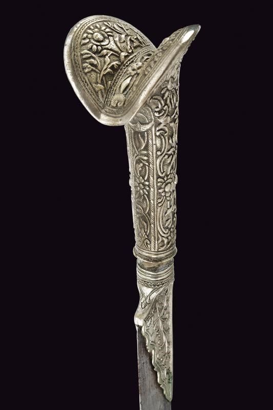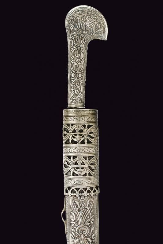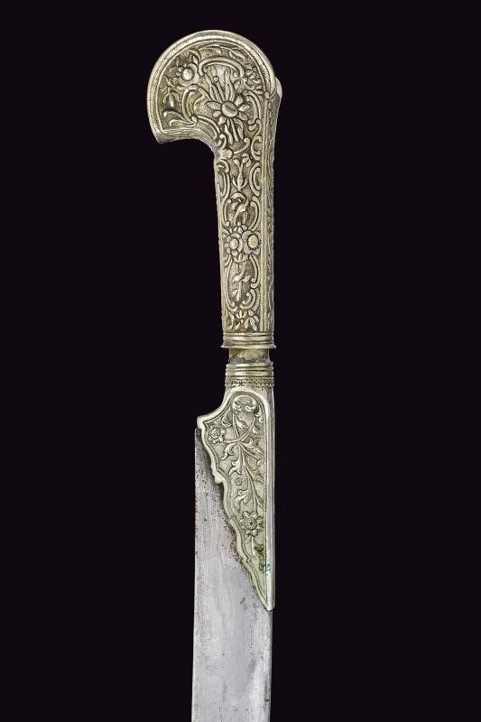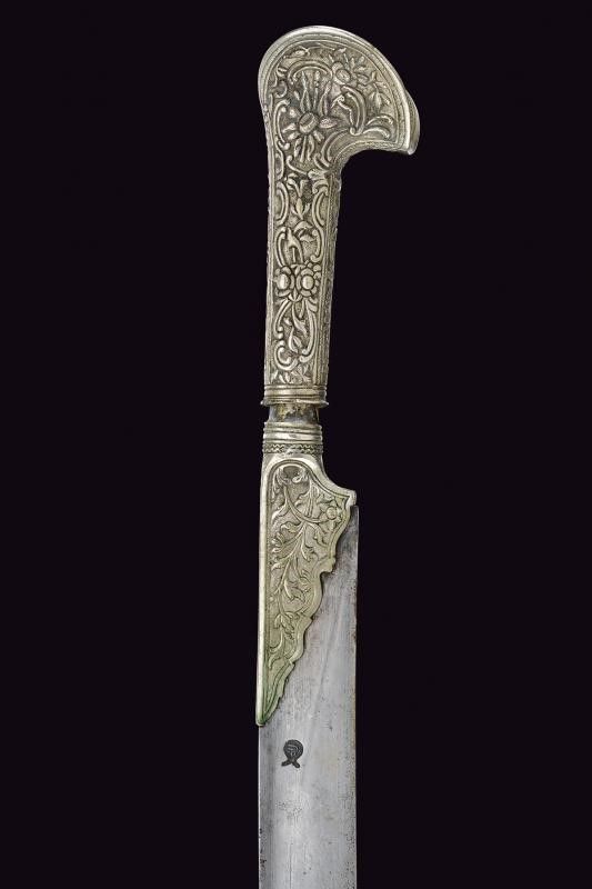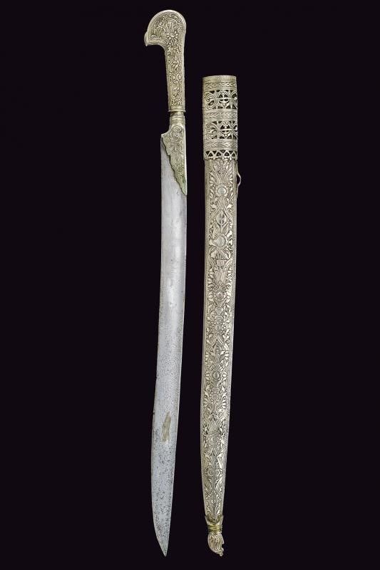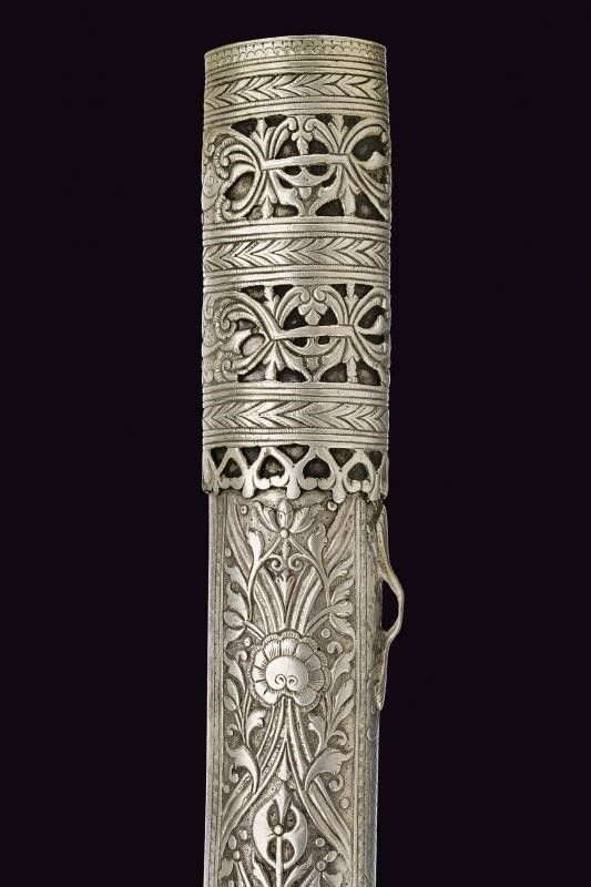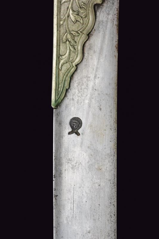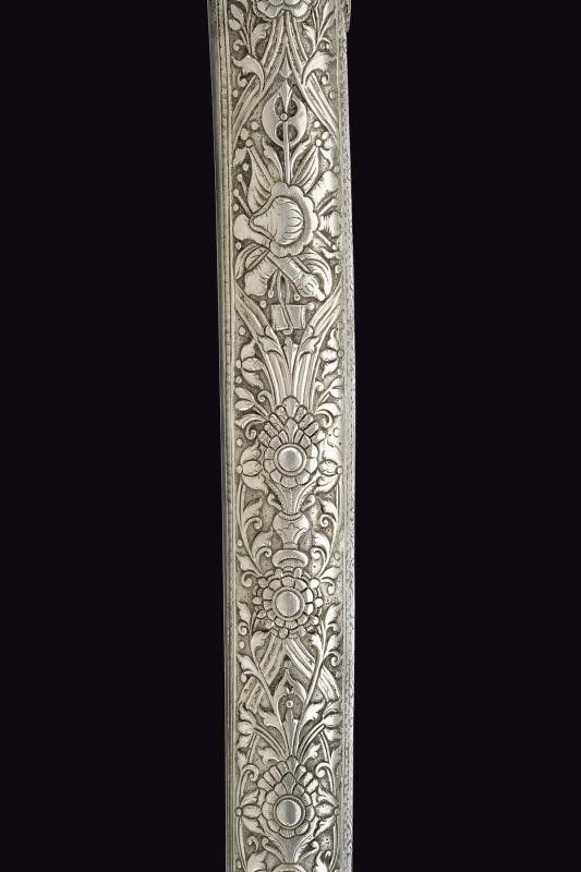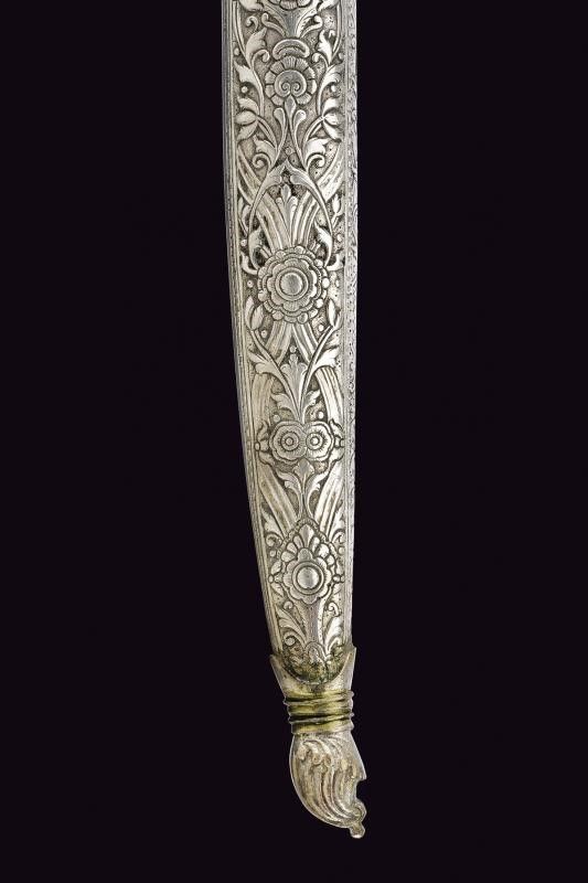 lunghezza 67 cm. XIX Secolo Lama lievemente controcurvata, con qualche intaccatura nella seconda metà, recante al forte un punzone. Fornimento in argento con ghiera e impugnatura riccamente ornate in rilievo a motivi floreali. Orecchie incurvate di medie dimensioni, queste recanti anche trofei, sempre in rilievo. Fodero in legno completamente rivestito con fornimenti in argento, questi ornati nel segmento centrale con trofei rilievati di cannoni, asce e bandiere, ad anche con fiori e rocaille. La cappa con piccole finestre che mostrano resti di tessuto messi a giorno. Forse una riparazione al puntale. Piccolo passante dorsale. Di elegante fattura.