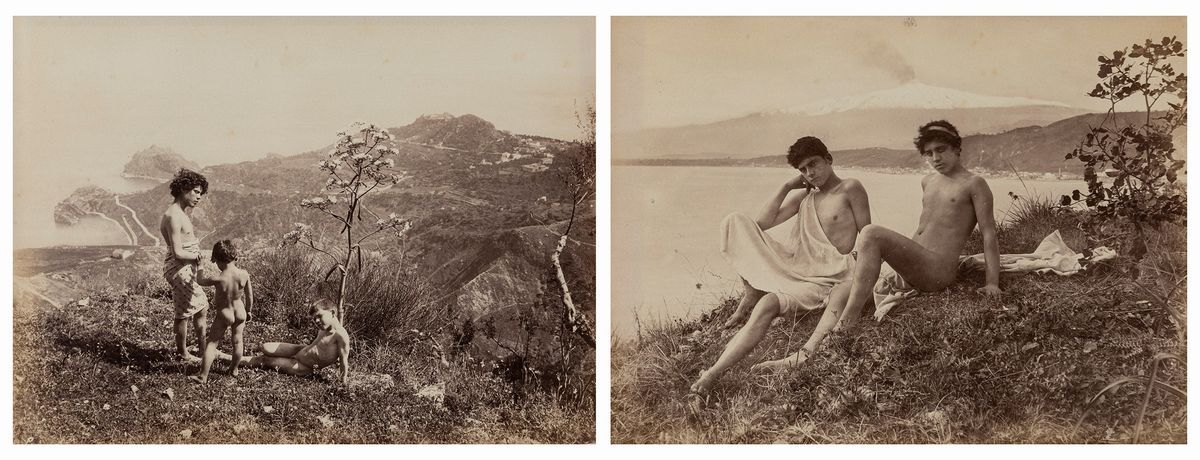 Due stampe all'albumina, applicate fronte e retro su cartoncino originale, cm 17,8 x 22,8 ; cm 17x 23 (cm 21,8 x 30,2 cartoncino)