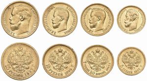 RUSSIA. QUATTRO MONETE (15, 10, 7 ½, 5 RUBLI) DI NICOLA II (1894-1917) Au 900 tot. gr. 32,25 BB/SPL [..]