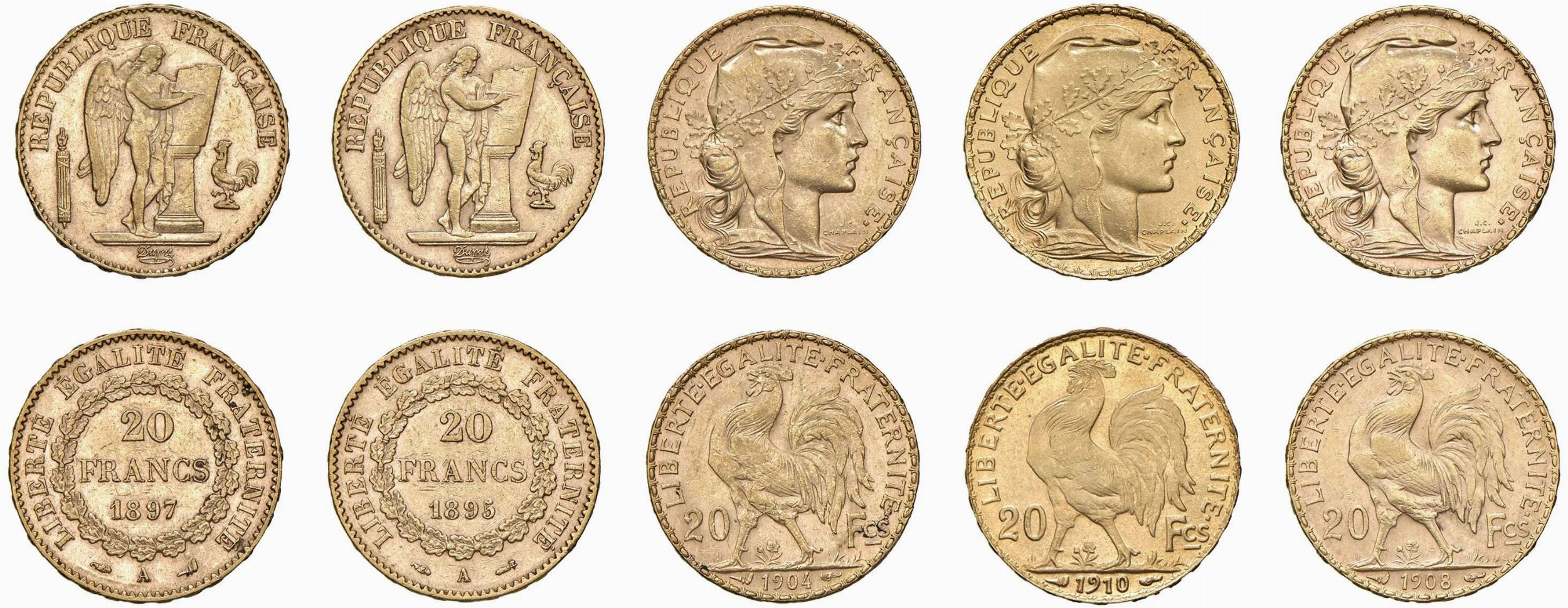 FRANCIA. CINQUE MONETE DA 20 FRANCHI ORO