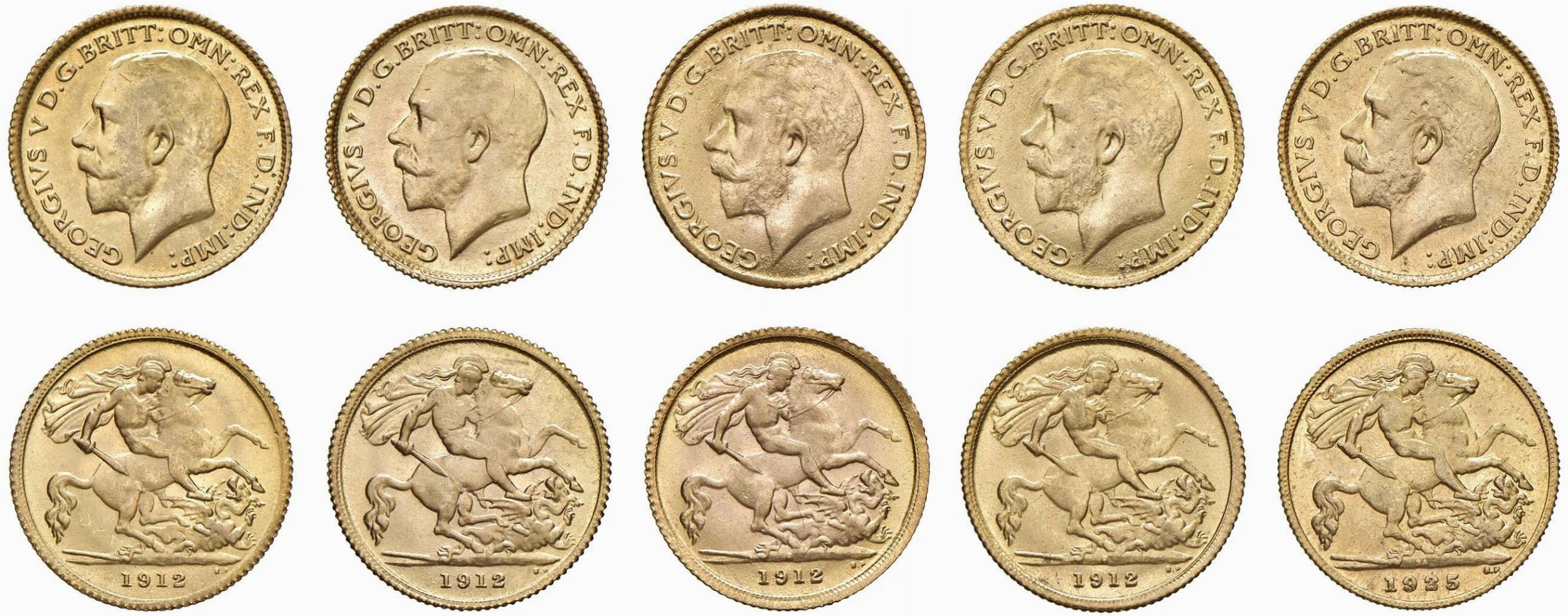 GRAN BRETAGNA. CINQUE RIPRODUZIONI DI MEZZE STERLINE ORO