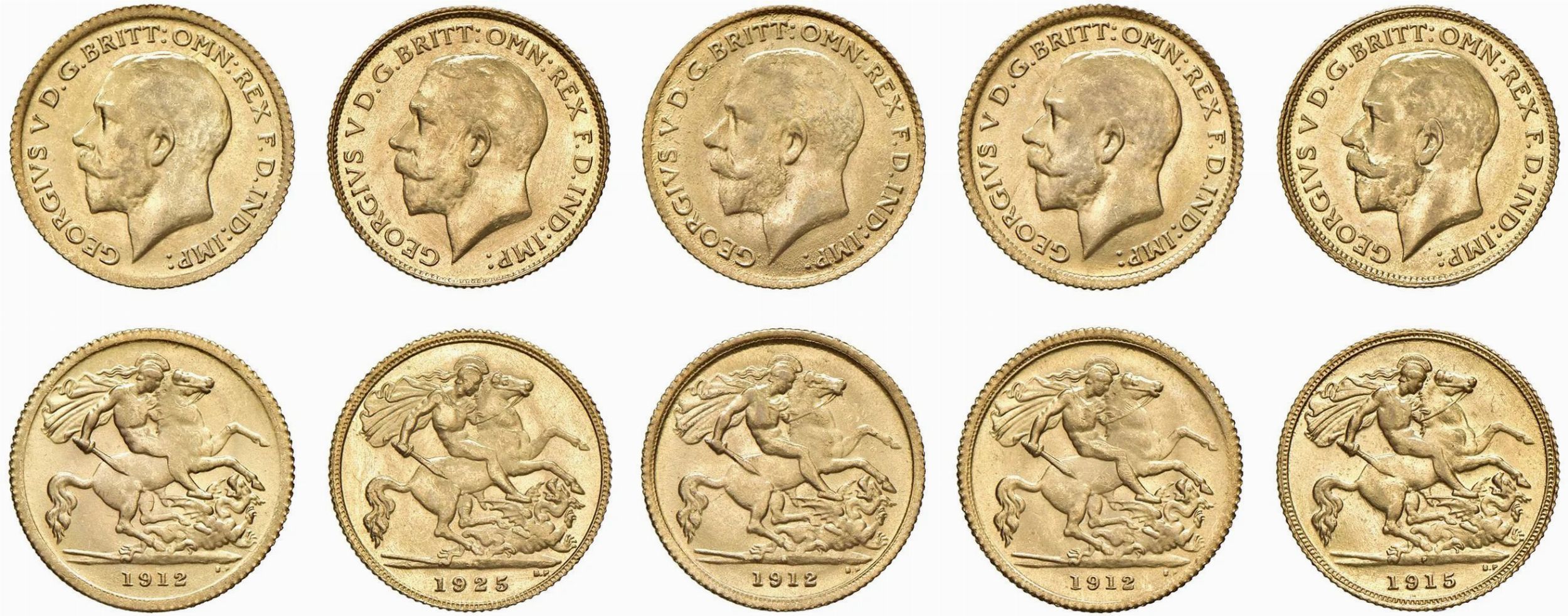 GRAN BRETAGNA. CINQUE RIPRODUZIONI DI MEZZE STERLINE ORO