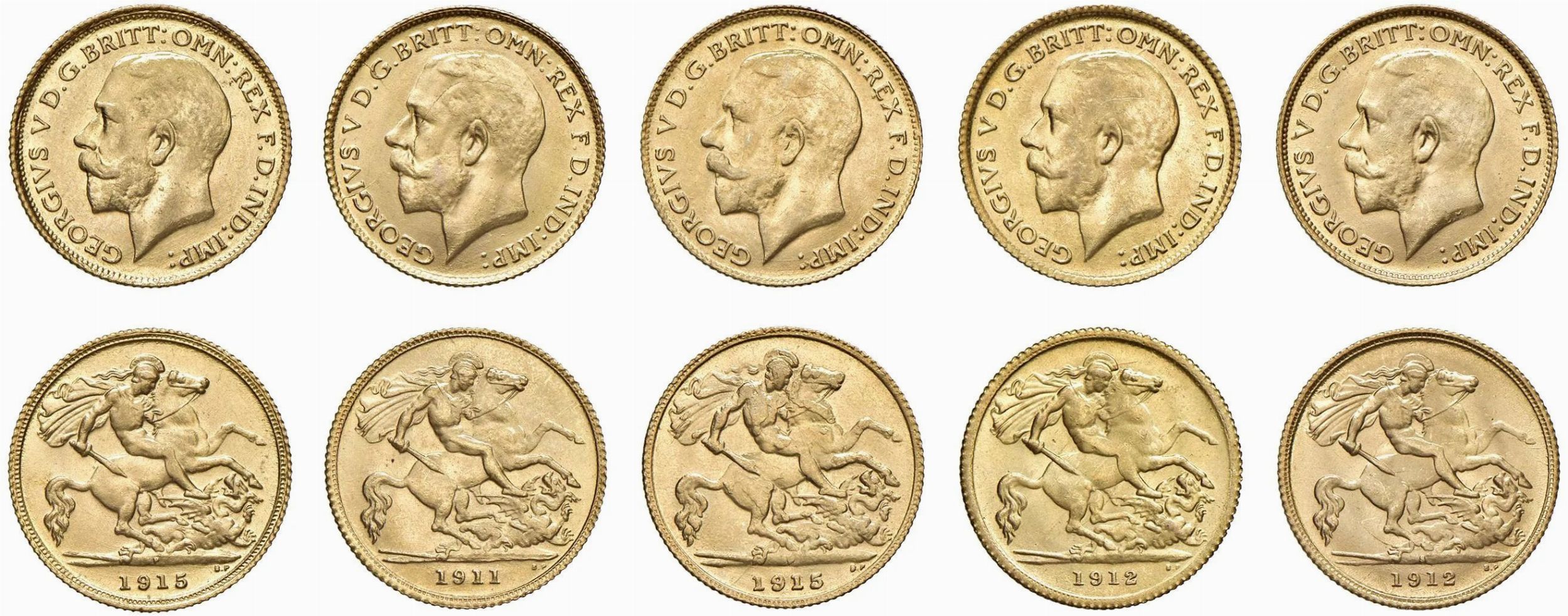 GRAN BRETAGNA. CINQUE RIPRODUZIONI DI MEZZE STERLINE ORO