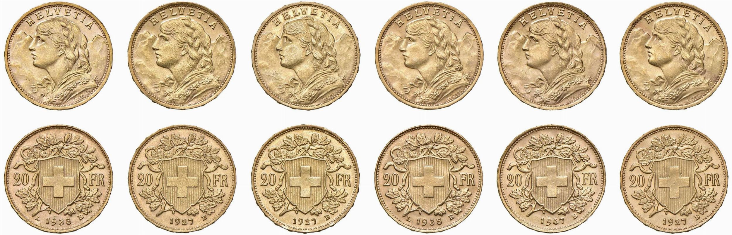 SVIZZERA. SEI MONETE DA 20 FRANCHI ORO