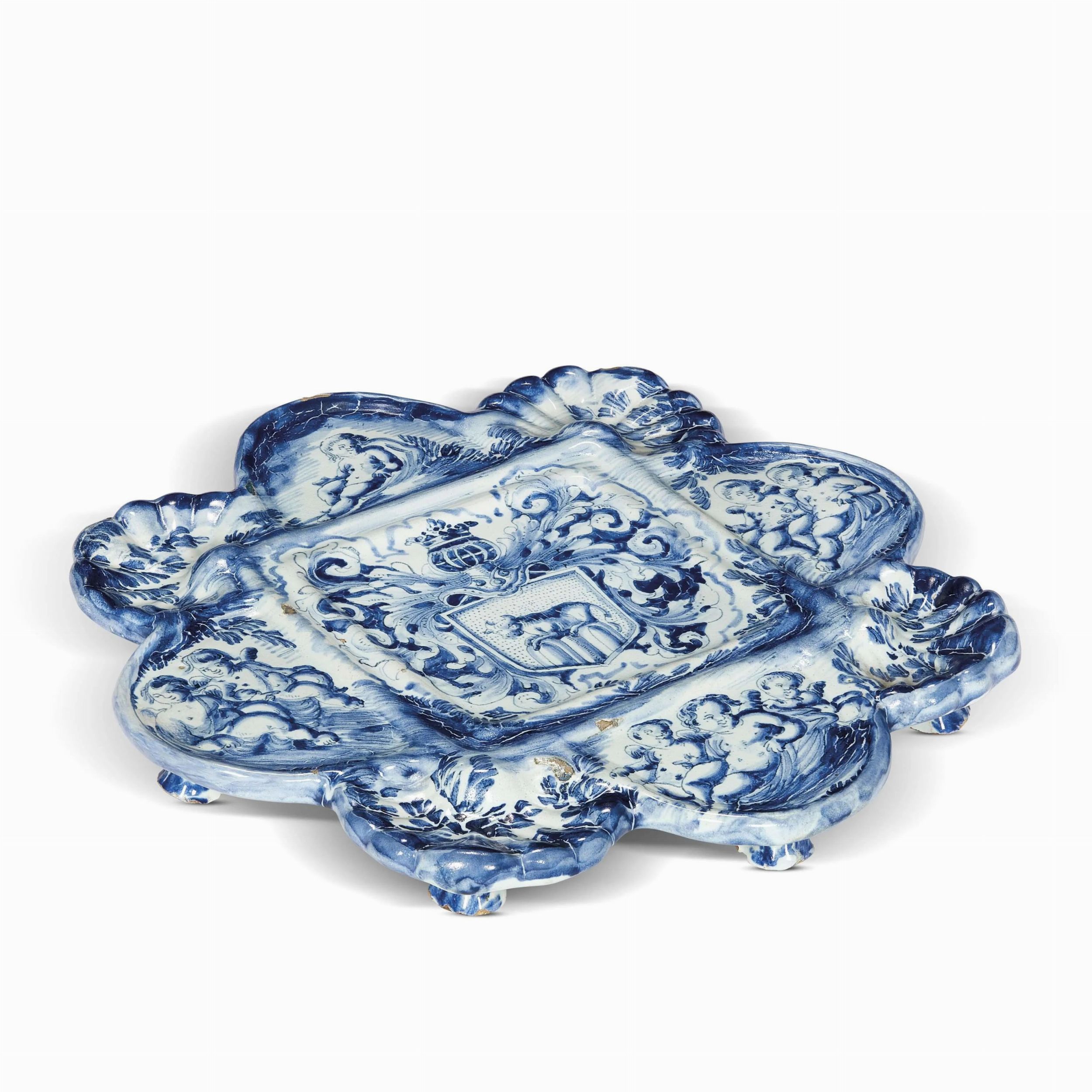 in maiolica decorata a monocromia blu e realizzata a stampo, presenta un cavetto centrale quadrato delimitato da un cordolo rialzato attorno ad otto lobature concave a guisa di valva di conchiglia, e poggia su otto piedini rilevati. Il decoro mostra al centro del cavetto un emblema araldico e intorno scene di putti. Al verso l’opera reca la marca con scudo, da attribuire genericamente a una fornace savonese del secolo XVII; cm 28x28, alt. cm 3,2